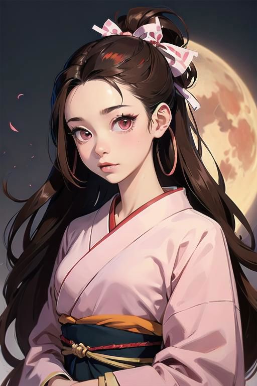 (((masterpiece))), nezuko, 1girl, bamboo, bit gag, brown hair, checkered sash, gag, gagged, gradient hair, hair ribbon, haori, japanese clothes, kimono, long hair, looking at viewer, multicolored hair, orange hair, pink eyes, pink kimono, pink ribbon, ribbon, solo, upper body, blood moon, <lora:nezuko-05:0.7>