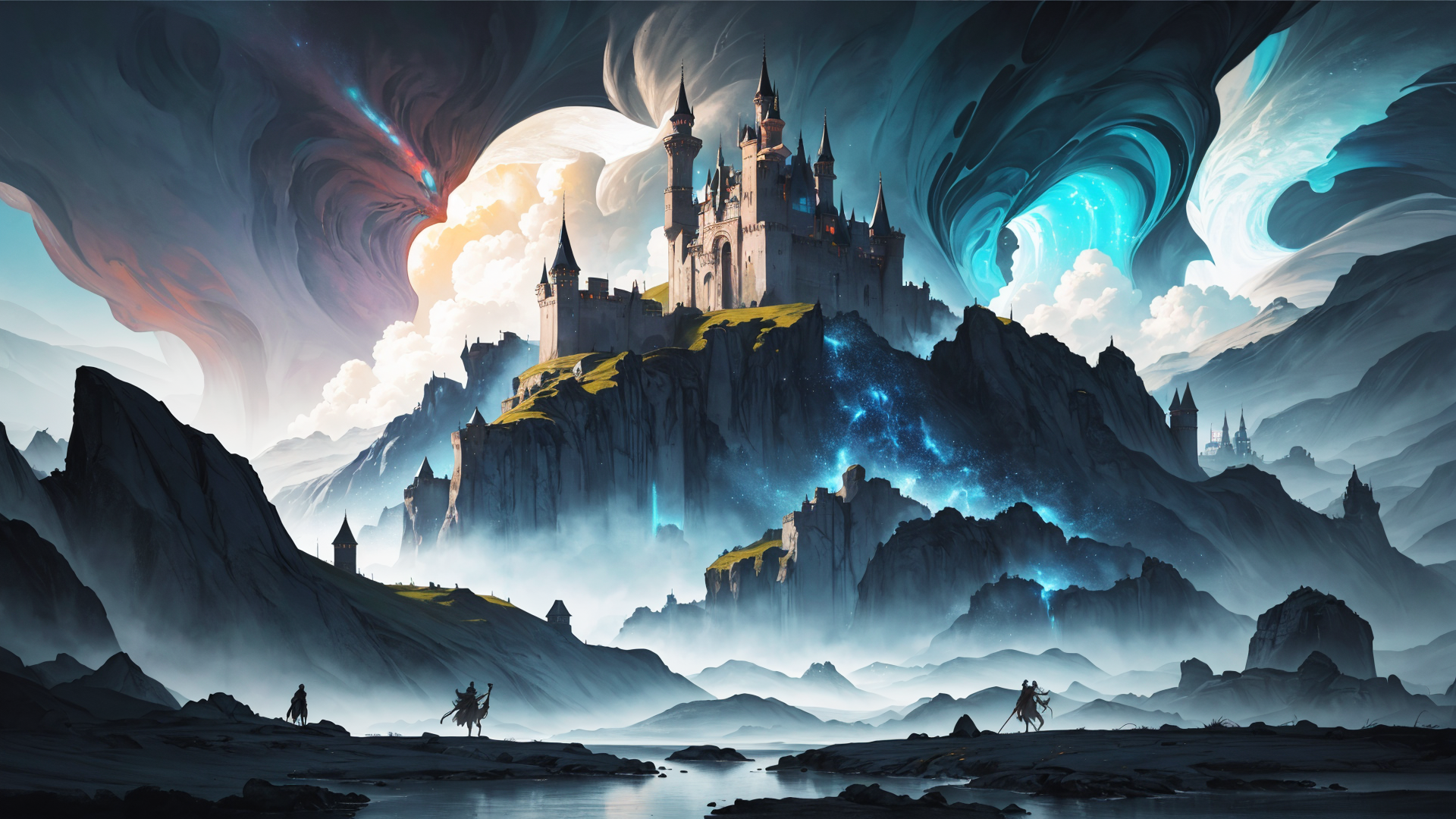 still life arrangement,fantasy world,magical landscape,dead ground surrounding castle with life,textured oil painting techniques,canvas adorned with blue and silver color splashes,precision,acrylic texture,soft ambient glow,surrounded by a tumultuous watercolor maelstrom,dramatic chiaroscuro with cinematic rim lighting,neon pulses cours,masterpiece,best quality,8k,intricate details,magnificent,celestial,ethereal,painterly,epic,majestic,magical,fantasy art,cover art,dreamy,
