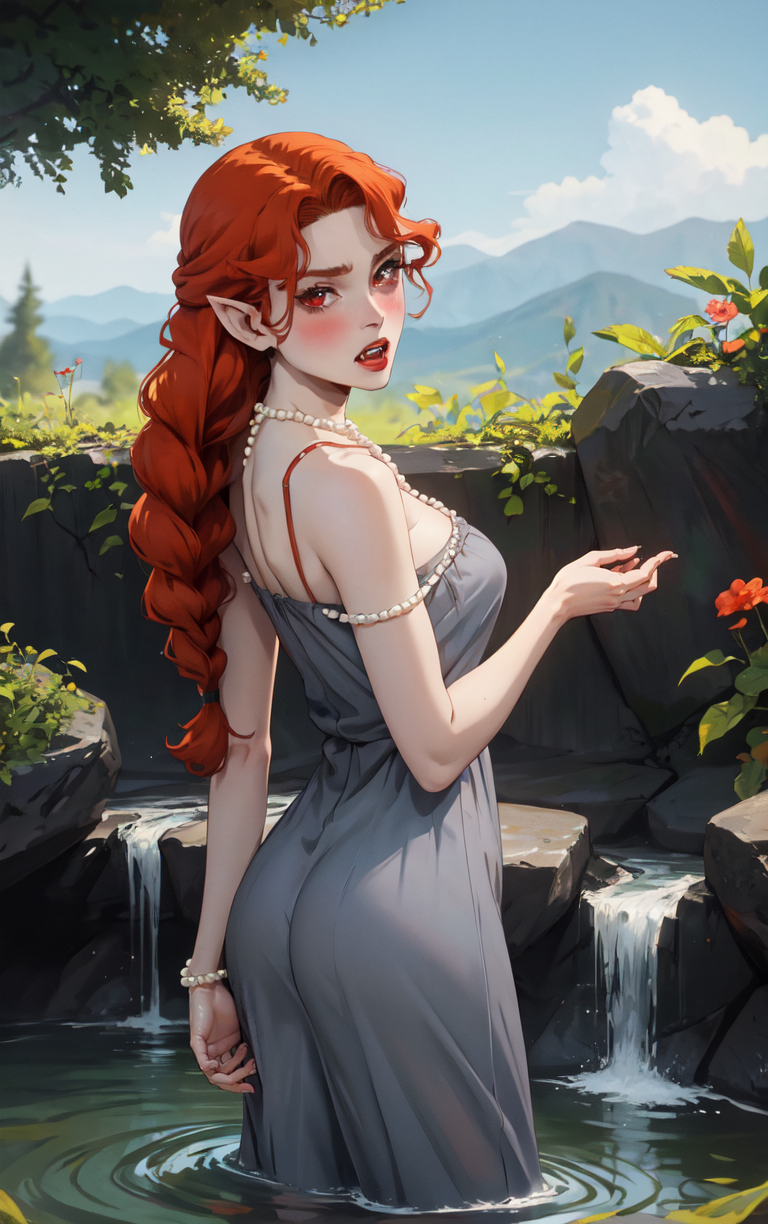 ((masterpiece, best quality)), insaneres, absurdres, solo, looking at viewer, NightGown_Lenore_ownwaifu, 1girl, long hair, red hair, red eyes, pointy ears, blush, breasts, cleavage, lips, red lips, collarbone, fangs, lipstick, makeup, vampire, braid, floating hair, jewelry, necklace, pearl necklace, armlet, grey dress, bare shoulders, (wading, ass support), waterfall, <lora:CARTOON_Castlevania_Lenore_ownwaifu:0.75>, depth of field, vanishing point, garden, sidelighting,