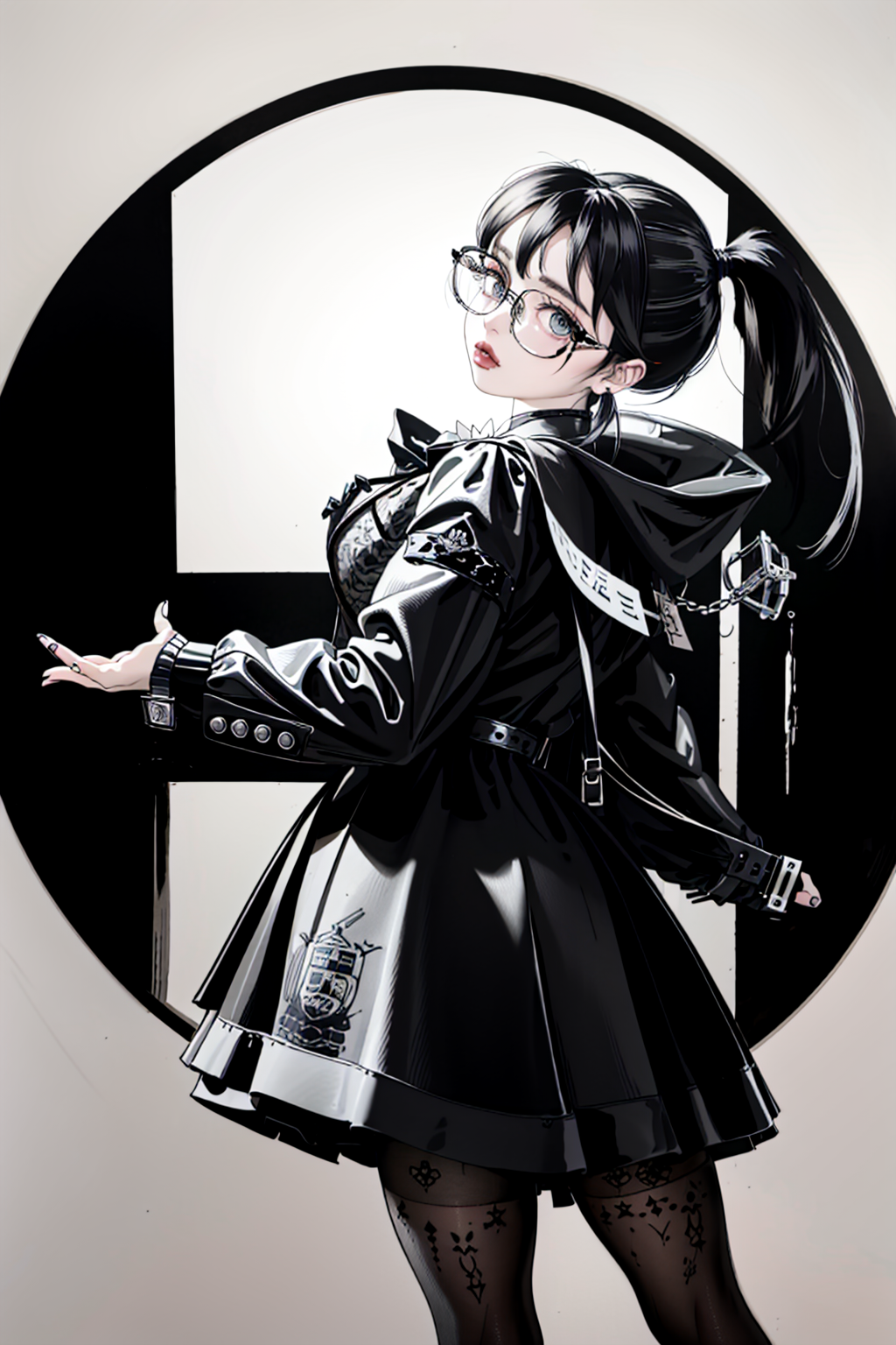 ((Masterpiece, best quality)), edgQuality,bimbo,glossy, GothGal, a woman in a black and white dress,ribbon,lace,goth print , eyepatch,woman wearing a GothGal outfit <lora:edgGothGal_MINI:1> <lora:amiyaAK:1> hiro, 1girl, monochrome, solo, greyscale, skirt, glasses, pencil skirt, long hair, looking at viewer, formal, breasts, ass, white background, simple background, office lady, ponytail, suit, looking back, signature, pantyhose, large breasts, watch, long sleeves, parted lips, jacket, dated, wristwatch, {{illustration}},{{{masterpiece}}},{{best quality}},{High resolution},{highres}, <lora:hiro:0.7>