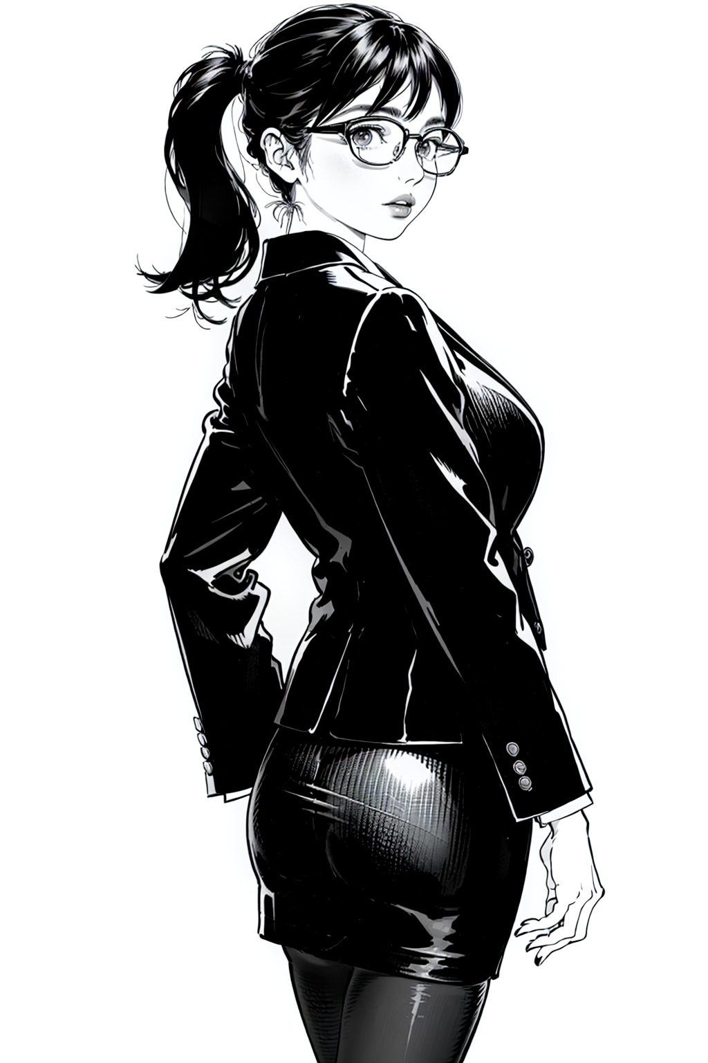 hiro, 1girl, monochrome, solo, greyscale, skirt, glasses, pencil skirt, long hair, looking at viewer, formal, breasts, ass, white background, simple background, office lady, ponytail, suit, looking back, signature, pantyhose, large breasts, watch, long sleeves, parted lips, jacket, dated, wristwatch, {{illustration}},{{{masterpiece}}},{{best quality}},{High resolution},{highres}, <lora:hiro:0.7>