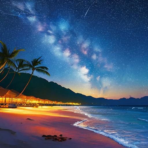 hawai beach, night, flying lamps background, milky way and stars, anime