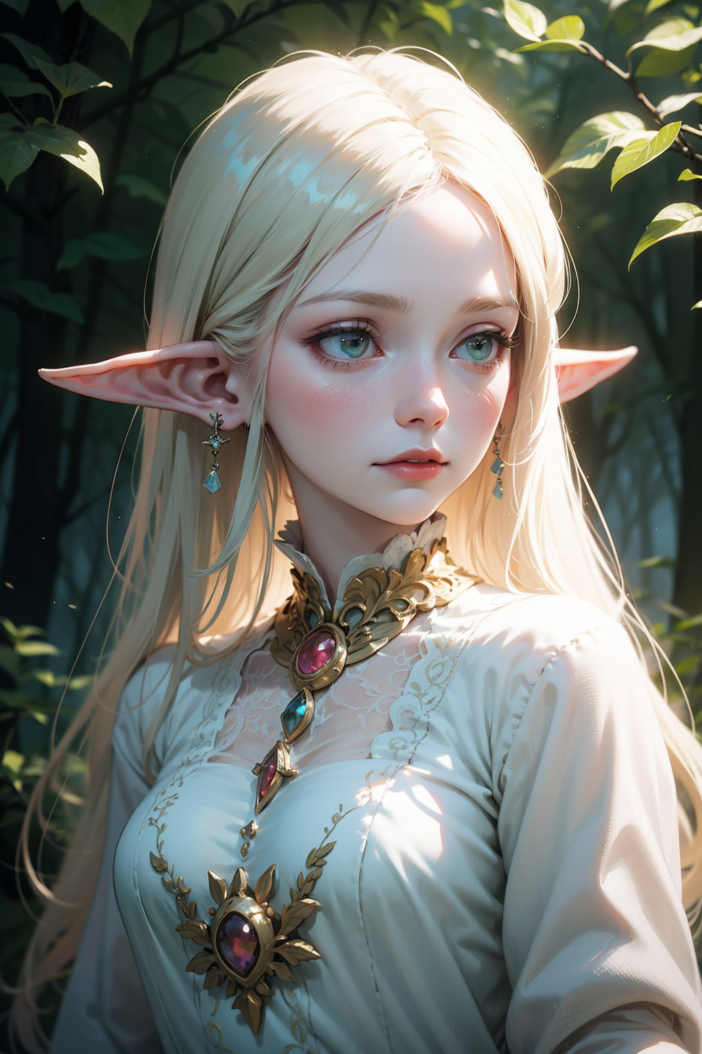 elf portrait,enchanting beauty,fantasy,ethereal glow,pointed ears,delicate facial features,long elegant hair,nature-themed attire,mystical ambiance,soft lighting,tranquil expression,harmonious with nature,subtle magical elements,serene,intricate jewelry,dreamlike quality,pastel colors,<lora:skin_tone_slider_v1:-2>,