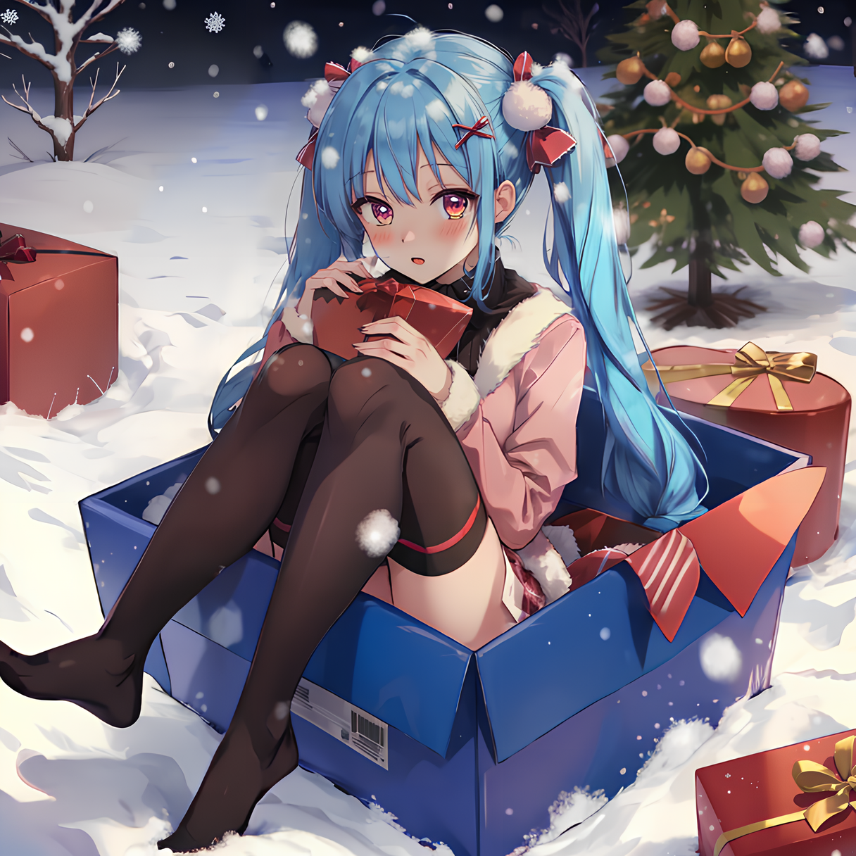 (high quality), aboxofkawaii, 1girl, solo, long hair, blush, thighhighs, twintails, sitting, box, christmas, snow, gift, blue box, <lora:abok_lora:1>