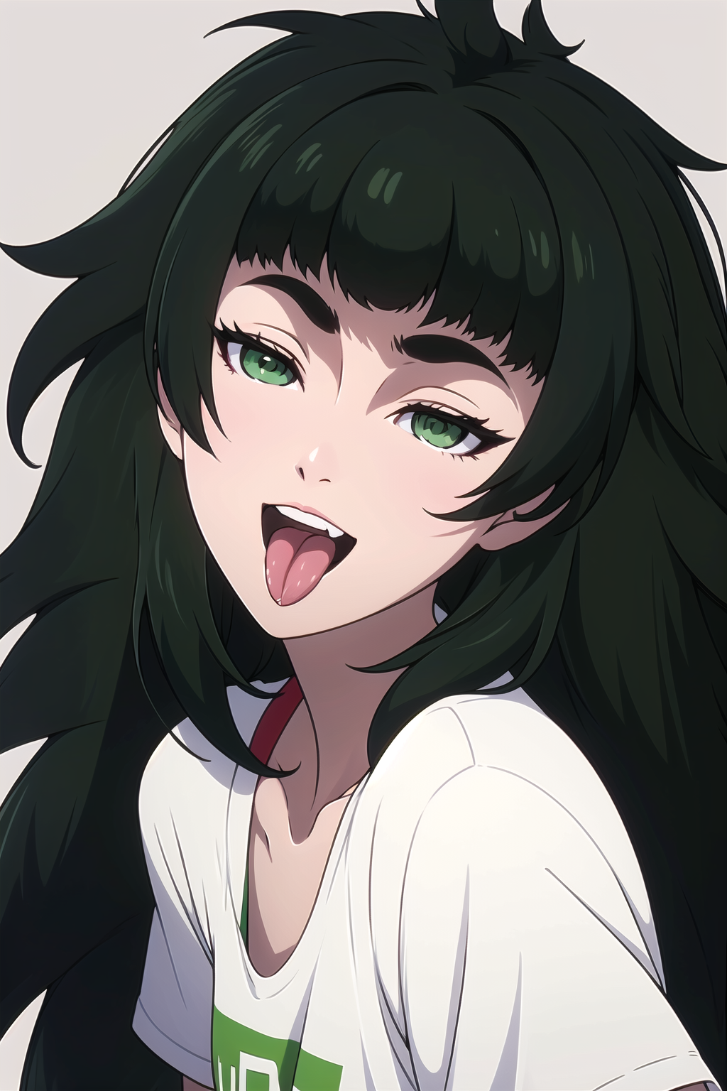 absurdres, highres, ultra detailed, <lora:MahoooV1-000009:1>, 1girl, maho, solo, black hair, blunt bangs, green eyes, very long hair, messy hair, white t-shirt, half-closed eyes, looking at viewer, smile, open mouth, tongue out, saliva, simple background