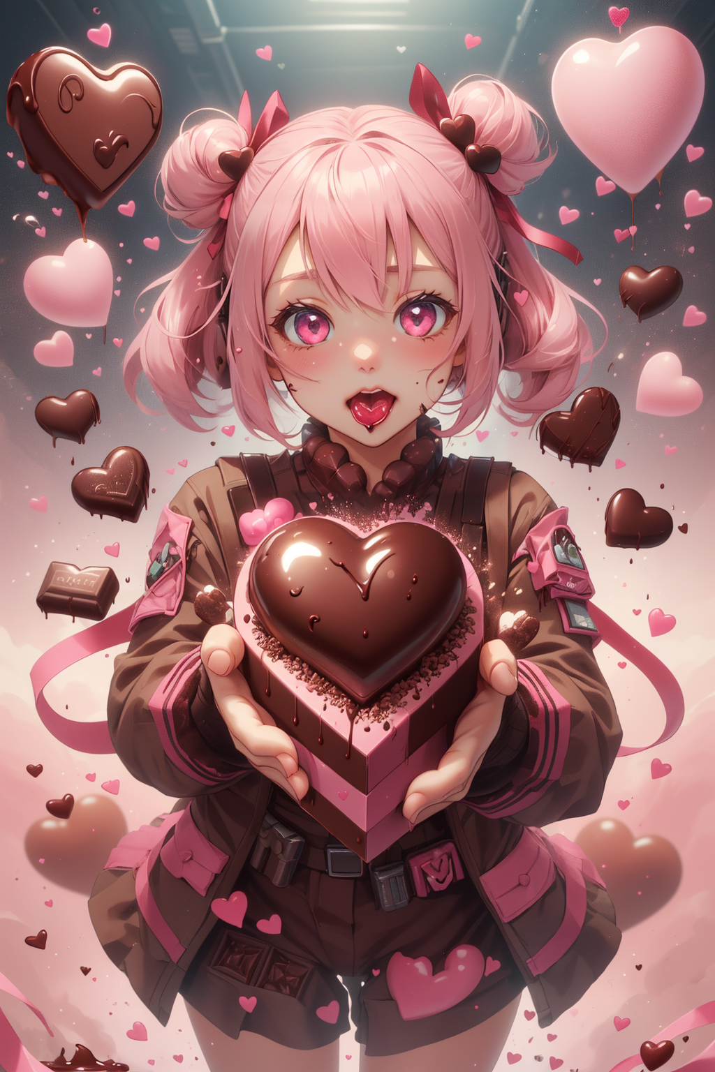 ((girl)),(kawaii),(kawaii),(chocolate war:1.2),(pink love bomb),(bubble gun),valentinetech,tasty details,scifi,gunfire,dust,<lora:ValentineTech-18:0.6>,love gift,