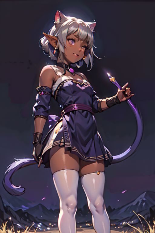 (masterpiece:1.2), (best quality:1.2), perfect lighting, beautiful, <lora:add_detail:0.5>, RAW, analog, Canon 85 mm, award winning glamour photograph, ((hyperrealistic)), fine details, 8k, uhd, extremely detailed body, (extremely detailed skin:1.2), clear, (professional lighting), highres, high detail, sharp focus, aesthetic, extremely detailed, max detail, natural skin texture, elegant, sharp focus, natural lights, HDR, high quality, (front view, standing, model posing:1.4), 1 girl, looking at viewer, elf girl, pointed ears, smug grin, fcNeg, check the prompts for ideas, fcNeg, (dark skin:1.5), elf, earrings, dark purple hair, witch, long hair, (silver eyes:1.5), thighhighs, gloves, indigo dress, cleavage, bare shoulders, elbow gloves, witch hat, white thighhighs, small bust, short stature, Style-GravityMagic, MNN_Taruto, Neko mage, dark purple cat tail