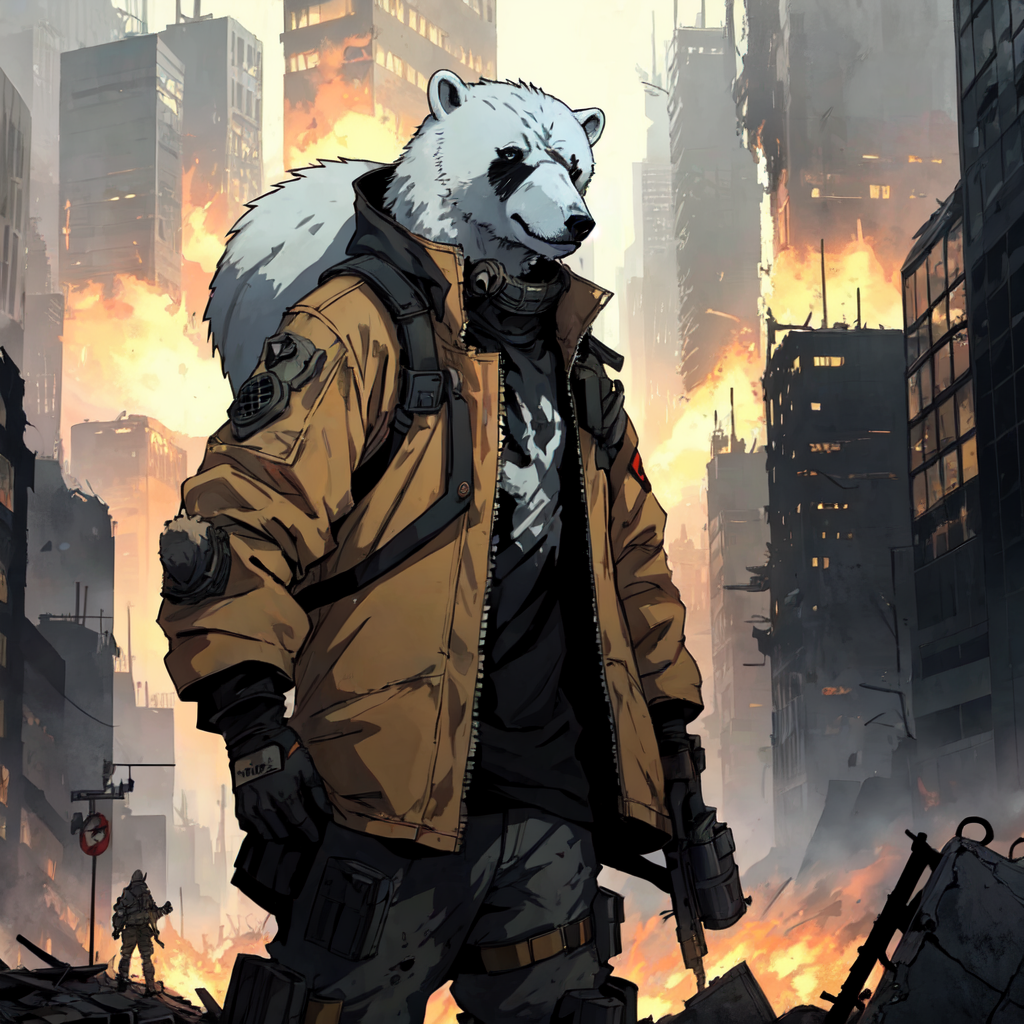 post apocalyptic polar bear wearing post apocalyptic clothing destroyed city, skyscrapers, fire, blame style anime, undefined