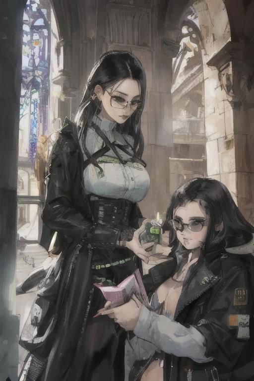goth girl on glasses, cathedral and together with a girl that has cyberpunk clothes smoking a cigarette