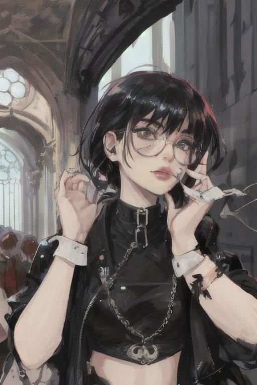 goth girl on glasses, cathedral and together with a girl that has cyberpunk clothes smoking a cigarette