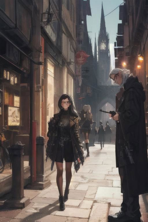 goth girl on glasses, cathedral and together with a girl that has cyberpunk clothes smoking a cigarette