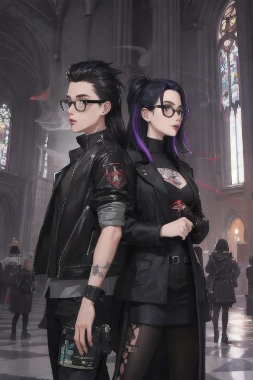 goth girl on glasses, cathedral and together with a girl that has cyberpunk clothes smoking a cigarette
