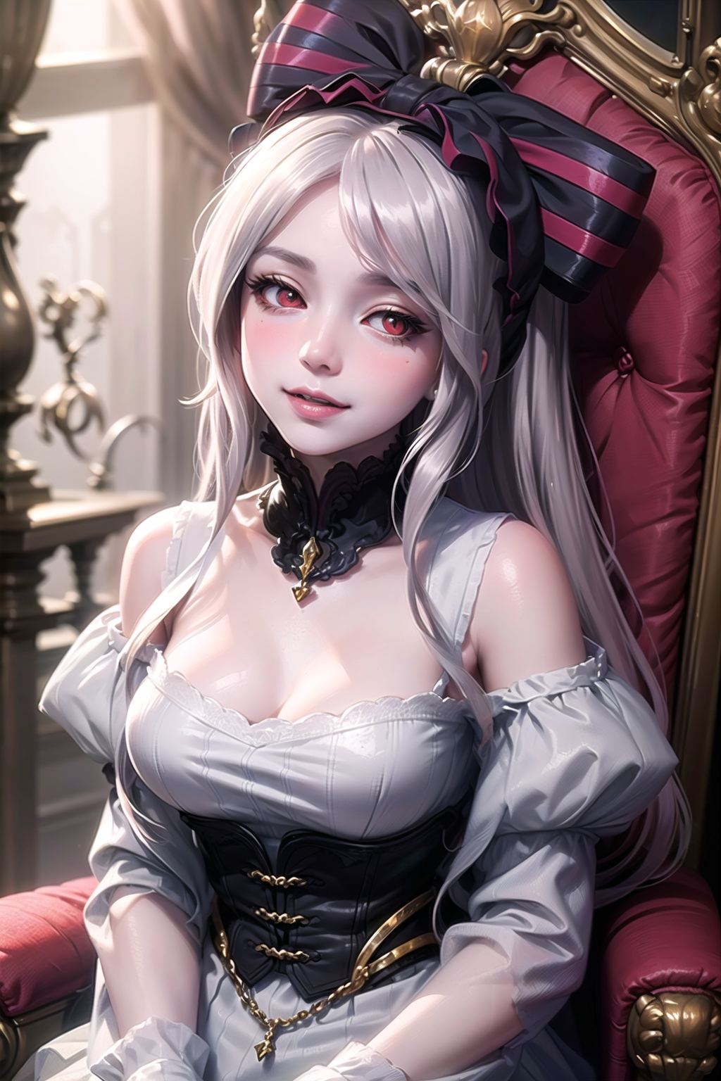official art, unity 8k wallpaper, ultra detailed, beautiful and aesthetic, beautiful, masterpiece, best quality, portrait, (finely detailed beautiful eyes: 1.2), shalltear, cute, medium breasts, pale skin, long gray hair, ponytail, (bonnet, large hair bow:1.2), (glowing red eyes:1.1), frilled black dress, long sleeves, captivating pose, arms at sides, half-closed eyes, smile, fang, blush, parted lips, seductive, lustful, hand on own face, head tilt, (looking at viewer:1.1), upper body, from above, throne room, <lora:SHALLTEAR:0.7>