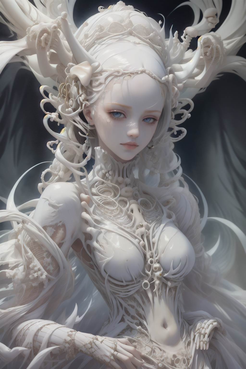 (masterpiece, top quality, best quality, official art, beautiful and aesthetic),1girl,solo,full body,look at viewer,white eyes,bones carving skin,dark white and light white,hollow body,meticulous portraiture,<lora:bones carving:0.9>,<lora:epi_noiseoffset2:1>,<lora:yuantu:0.4>,