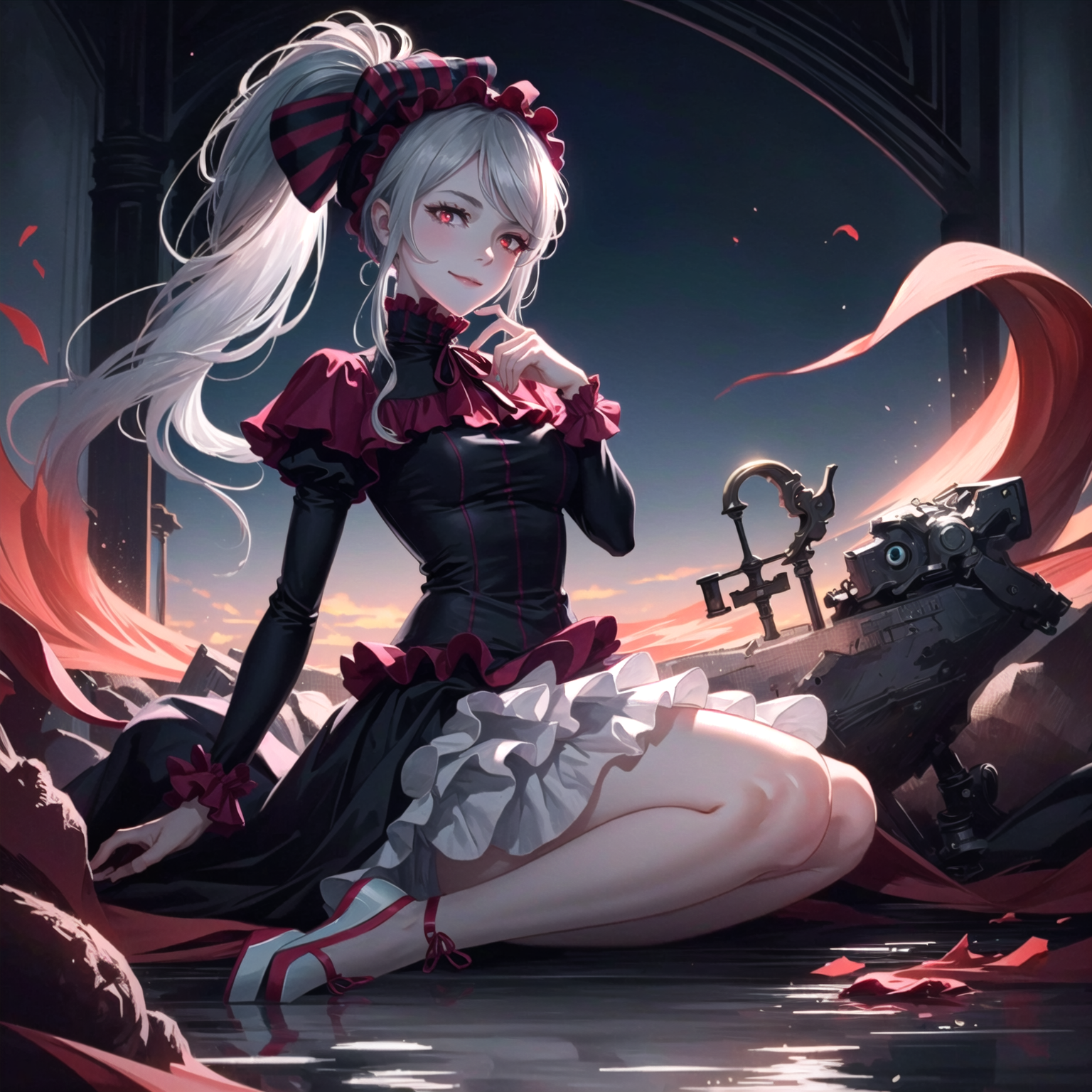 masterpiece, best quality, ultra-detailed, illustration, epic lighting, cinematic composition, isometric, (hexagon:1.2), shalltear bloodfallen, shalltearcostume, cute, medium breasts, pale skin, long gray hair, (ponytail:1.1), bonnet, (hair bow:1.1), (glowing red eyes:1.2), enchanting gaze, (half-closed eyes:1.1), (seductive smile:1.2), fang, sitting, kneeling, looking at viewer, focus on the eyes, night, dark, red glow, night sky, (8k:1.1), <lora:shalltearBloodfallen_v10:0.9>