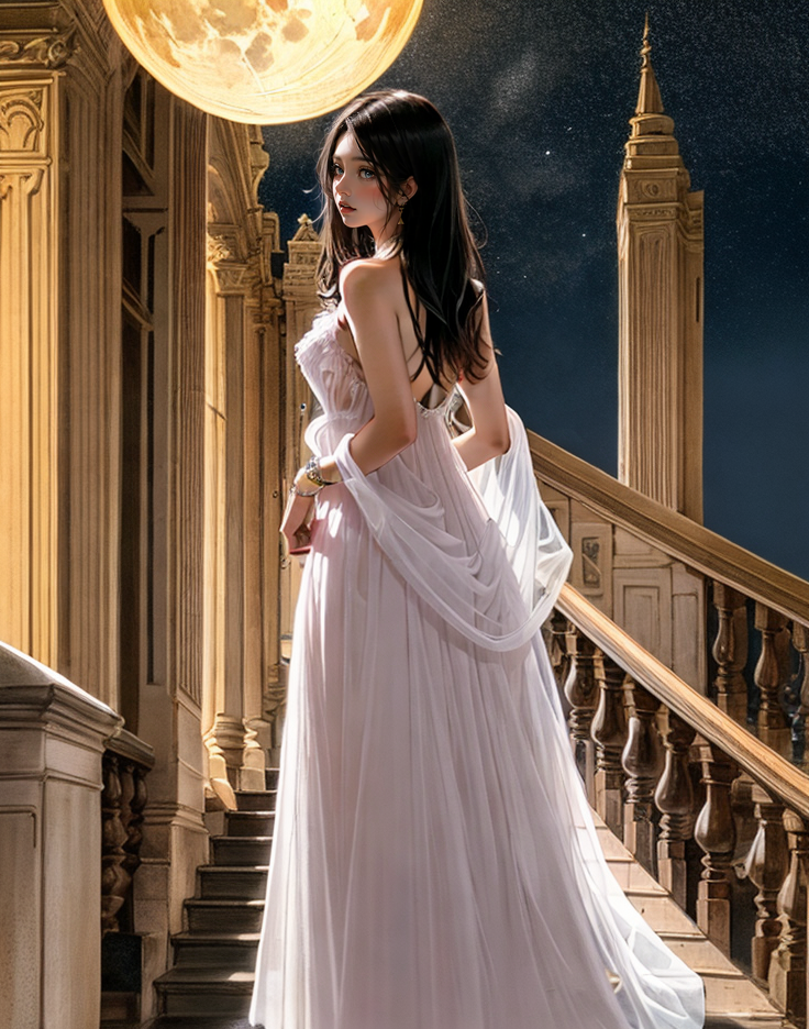 (1girl),dress,jewelry,masterpiece,ultra realistic,32k,extremely detailed CG unity 8k wallpaper,best quality, fairy dress, black hair, night, moon, <lora:Fairy Dress-000008:0.5>