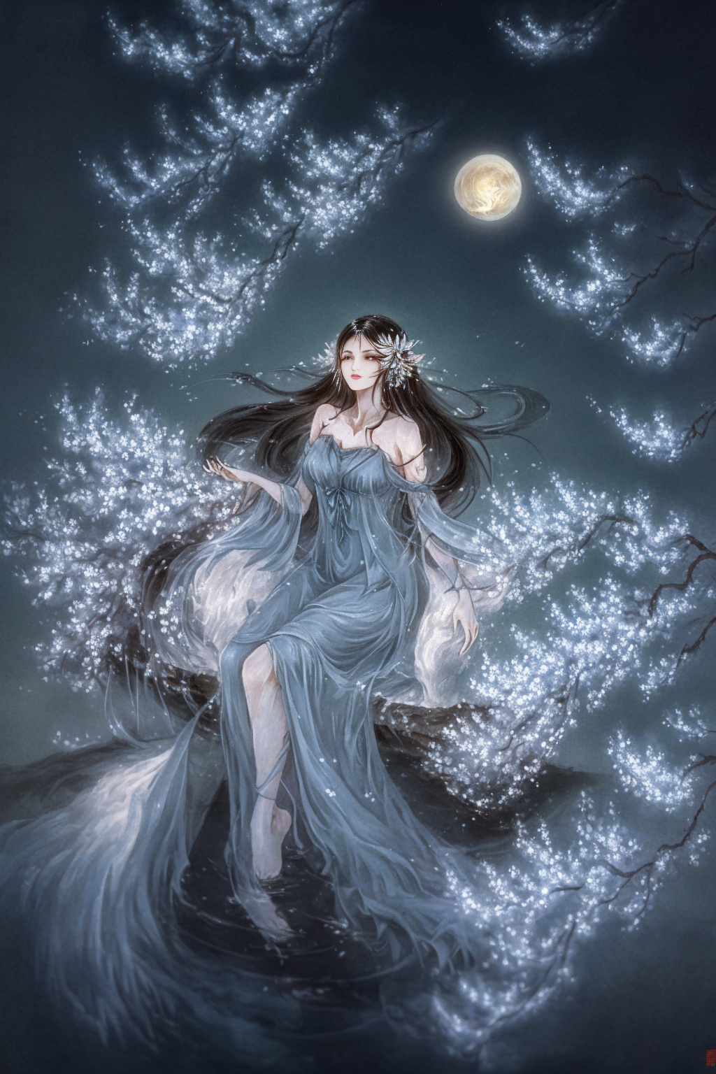 shanze, 1girl, flower, dress, long hair, solo, blue dress, moon, hair ornament, sitting, black hair, water, night, branch, high quality,
