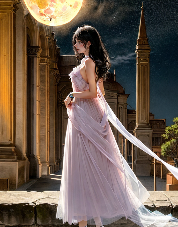 (1girl),dress,jewelry,masterpiece,ultra realistic,32k,extremely detailed CG unity 8k wallpaper,best quality, fairy dress, black hair, night, moon, <lora:Fairy Dress:0.5>