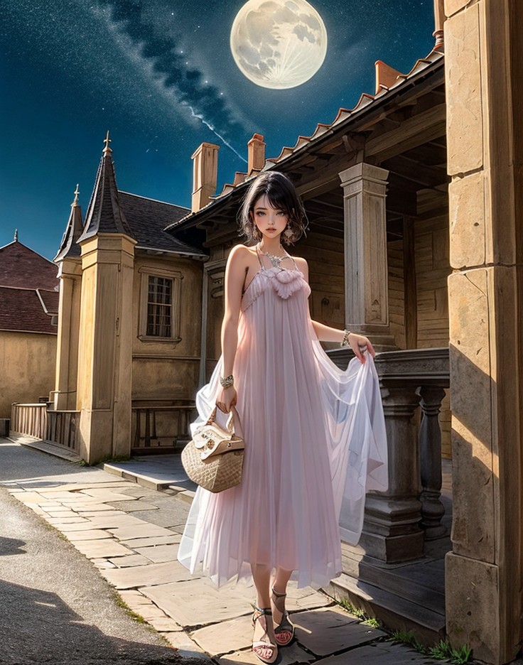 (1girl),dress,jewelry,masterpiece,ultra realistic,32k,extremely detailed CG unity 8k wallpaper,best quality, fairy dress, black hair, night, moon, cloud, castle <lora:Fairy Dress-000008:0.5>