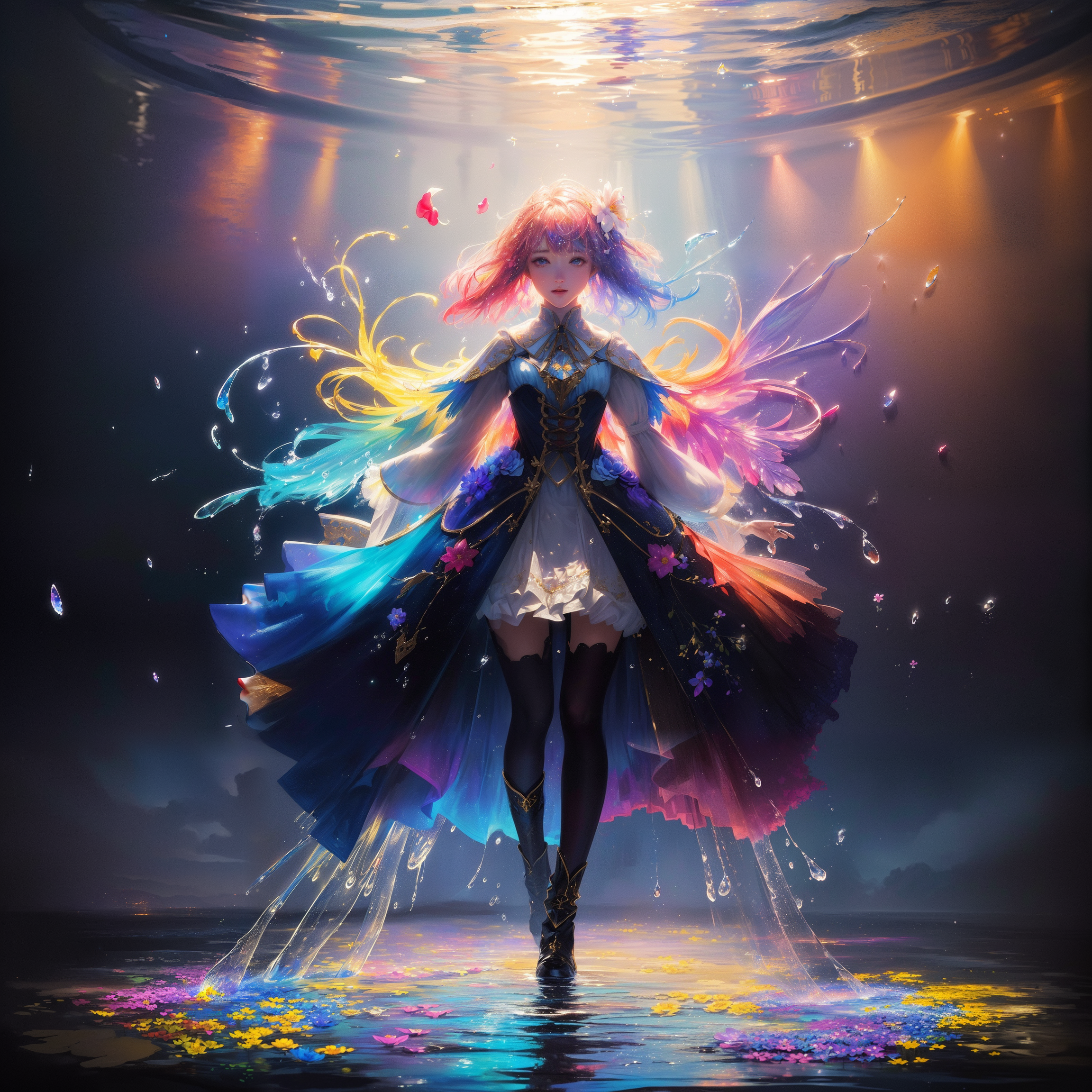 fantasy (failed magic) (ultra quality, masterpiece, ultra realistic, ultra detail, 8K award-winnig photo:1.2), 1girl, intricate details(colorful, colored water splash, flower explosion:1,2), beautiful face, thin and colorful beams of light, hyperrealistic, ray tracing