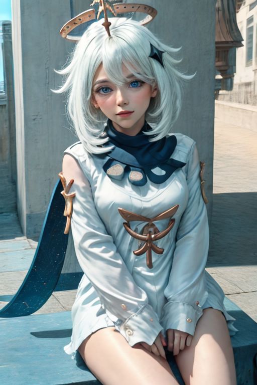 (masterpiece:1.4), (Best quality:1.2), (highres:1.2), (scenary:1.2), Dynamic light, 4k, 8k, facing viewer, blue sky, sky, temple, looking at viewer, stairs, paimondef, blush, white hair, blue eyes, (sitting), smile, bare legs, ((Paimon)), paimonrnd,, real eyes,, realistic eyes, young face,
