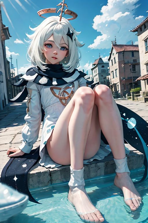 (masterpiece:1.4), (Best quality:1.2), (highres:1.2), (scenary:1.2), Dynamic light, 4k, 8k, facing viewer, blue sky, sky, temple, looking at viewer, stairs, paimondef, blush, white hair, blue eyes, (sitting), smile, bare legs, ((Paimon)), paimonrnd,, real eyes,, realistic eyes, young face,