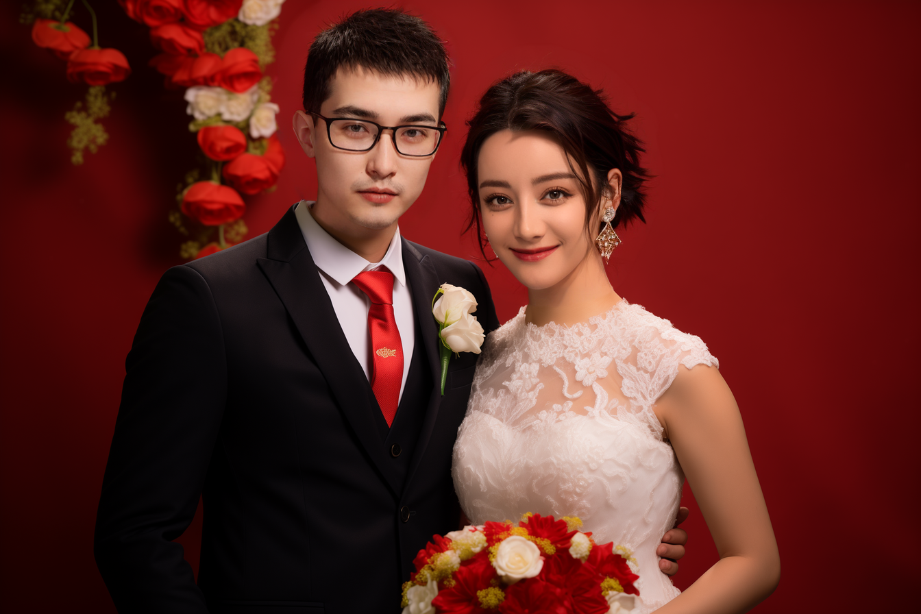 1girl,1boy,<lora:djc_2-000008:0.7>,red background,realistic,brown eyes,black hair,upper body,looking at viewer,short hair,black-framed_eyewear,(looking_at_viewer:1.1),