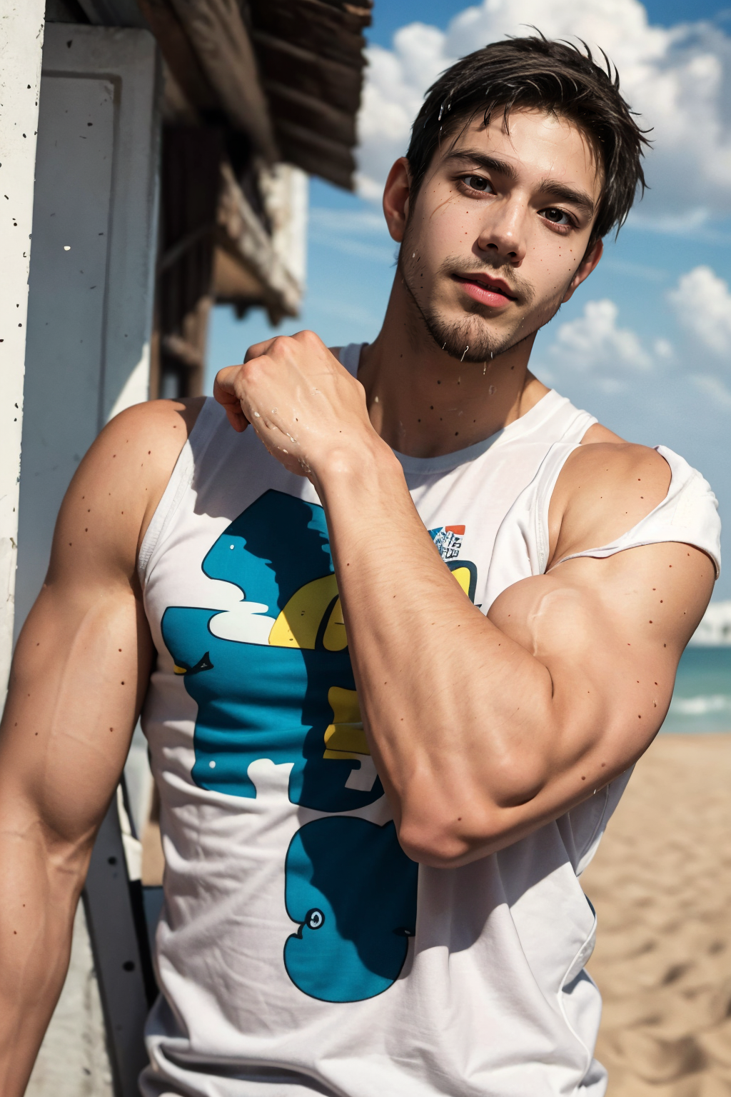 <lora:kevinhejnas_18000:1>, kevinhejnas person, sunburn, a young guy wet tank top, (drop low-cut armhole), big bare shoulders, laying the sand, muscular guy, facial hair, beard, sharp focus, 1boy, extra wide-range, full body, big biceps, flexing biceps pose, <lora:lora_SoakingWetClothes2_19200_lora-SD15NewVAEpruned:0.4>, SoakingWetClothes, detailed eyes, (masterpiece, best quality:1.5)