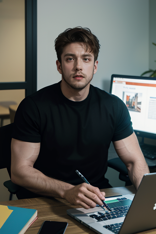 ramirolozano person, blonde hair, ginger mature man, eyesglasses, night time, black shirt, big shoulders, muscular body, lay on chair, desktop, laptop, look at pc, facial hair, beard, sharp focus, 1boy, extra wide-range, look looking at viewer, office, at work, <lora:ramirolozano_12210:1>, neon lighting, (masterpiece, best quality:1.5)