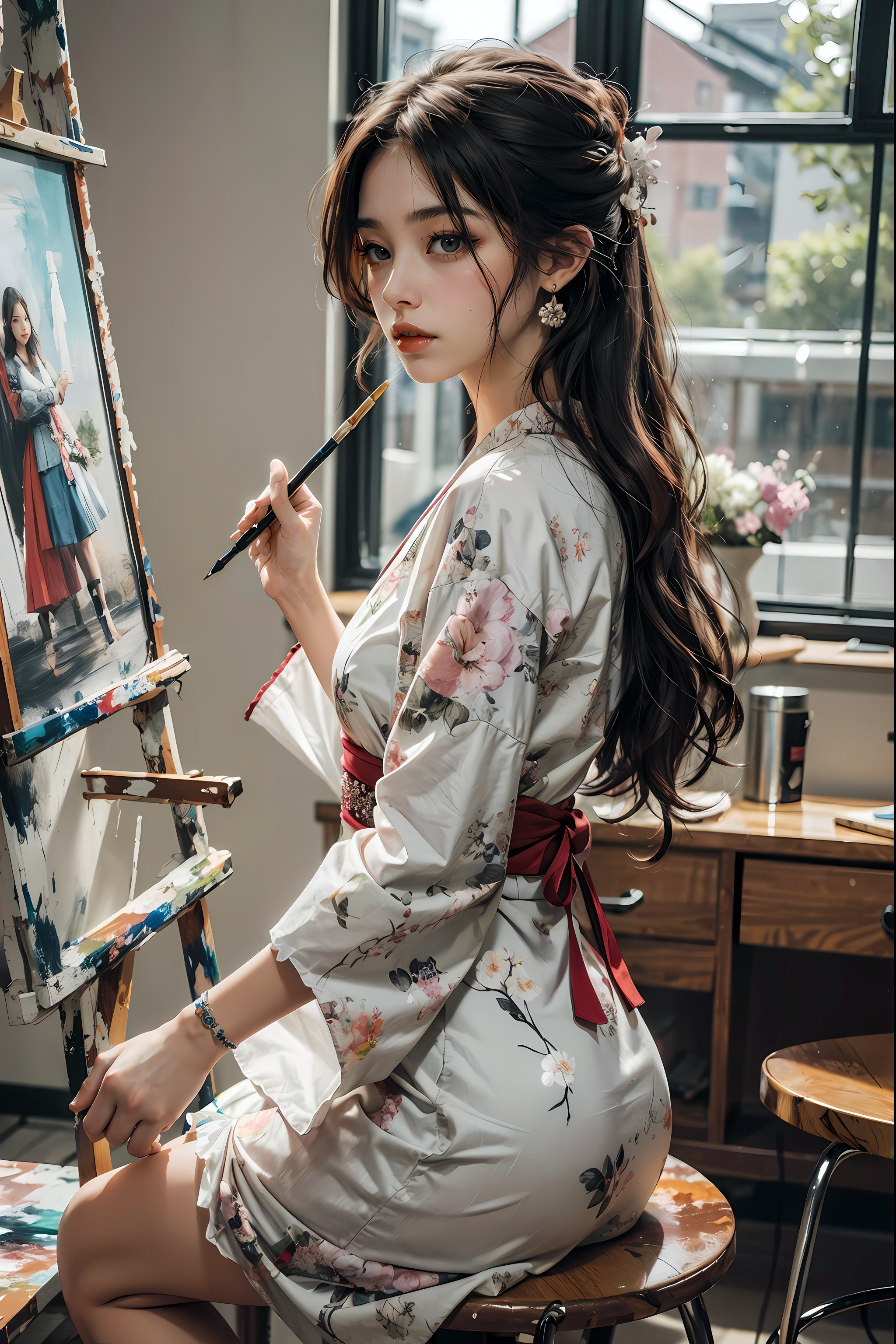 (absurdres, abstract, artwork, official art:1.2), (blurry background), (private craft shop, private workroom:1.7), soft and warm lighting, (profile, feet out of frame:1.2), ((1girl, solo)), (look at viewer), dynamic pose, indoors, (painting \(action\):1.5), painting \(object\), art brush, paintbrush, palette \(object\), watercolor painting on canvas \(object\), holding, holding small-paintbrush and palette \(object\), art tool, dramatic shadows, BREAK artwork display shelves with finished paintings, BREAK picture frame/curtains, BREAK soft backlighting from wide and huge frameless window, BREAK (flowers in bloom:1.5), earrings, jewelry, long hair, (wavy hair), (stylish, elegant, Japanese clothes, dress, long dress, frills, long long sleeves, (wide sleeves:1.2), floral print, kimono, dress), light_makeup, ((teenage)), human body ratio, pale skin, shiny skin, parted lips, realistic, realistic_scale, (best quality:1.4), (masterpiece:1.4), (extremely intricate detail), extremely delicate and beautiful, beautiful and aesthetic, (cute, pretty), <lora:add_detail:0.5>,
