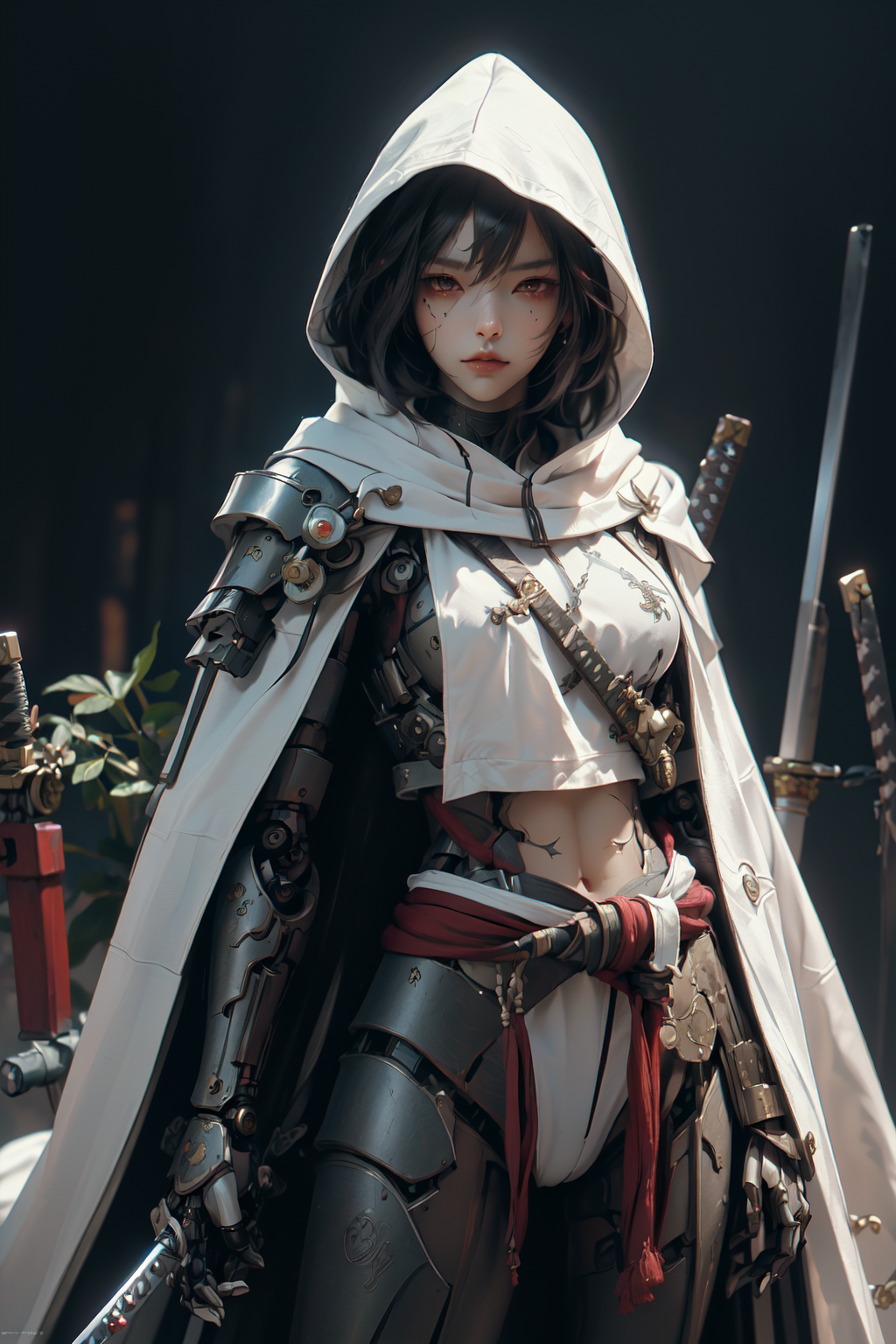 (masterpiece, best quality:1.3),extremely high detailed, 1male robot wearing cloak, (white cloak:1.2), holding sword, katana, god of war, intricate, 8k, HDR, wallpaper, cinematic lighting, (universe), ), (fighting other characters:1.2), glowing, armor, glowing eyes, mecha, large wings, <lora:Samuraibot:0.7>