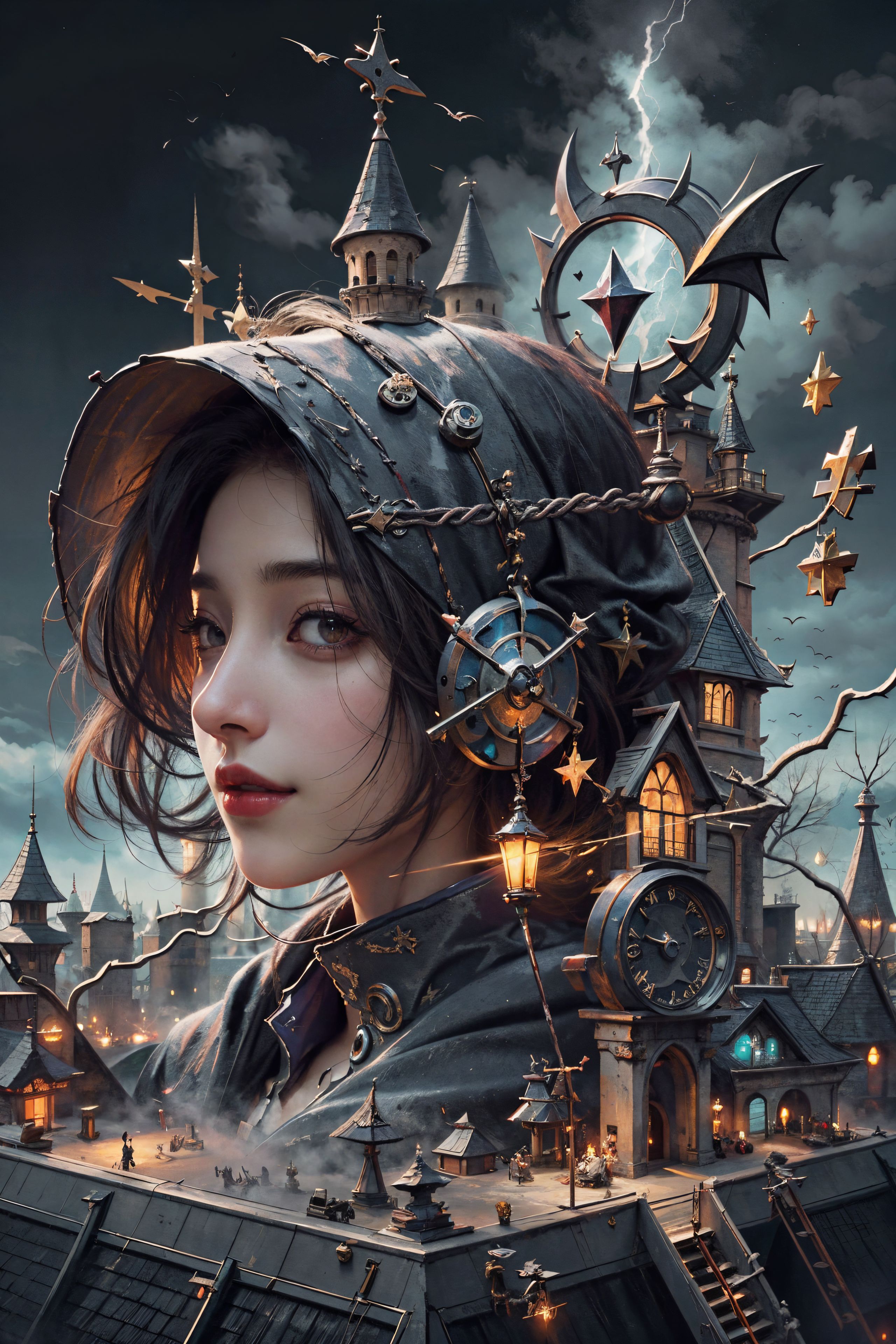 Best quality,masterpiece,ultra high res,photorealistic,raw photo,unity 8k wallpaper, 1girl, evil grin, castle, wizardry, lightning, <lora:WitchcraftPunkAI:0.6>