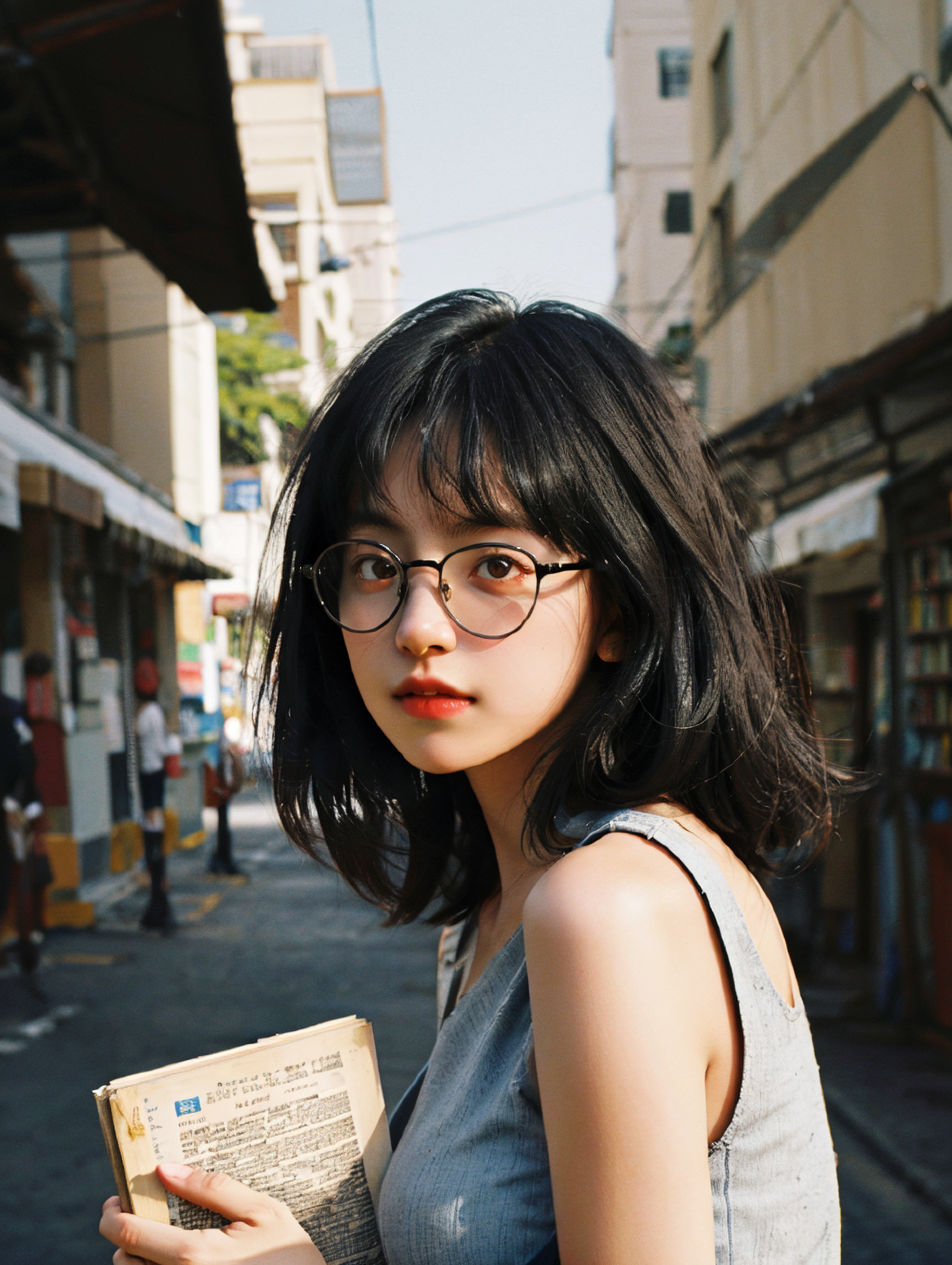 1girl, black hair,sleeveless vintage dress, wear glasses,( side shoulder towards the viewer:1.3), head tilted towards the viewer, looking at viewer while reading, single-lens reflex camera, film grain, 1980s \(style\), in front of a vintage book store, day, <lora:Velvia1:0.6> summertime,EF_70mm, masterpiece, best quality,street photograph,(polaroid:0.8),