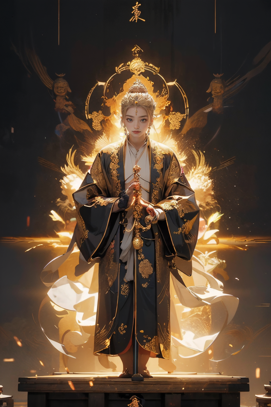 (masterpiece:1.2),best quality,PIXIV,taoist,(meditation:1.3),Daoist_Robe,closed eyes,full body,Keep head down, solo,a buddha standing in front of blonde,glowing taoist,transparent,<lora:taoist_20230623200708:1>,<lora:Daoist_Robe_v2:0.4>,
