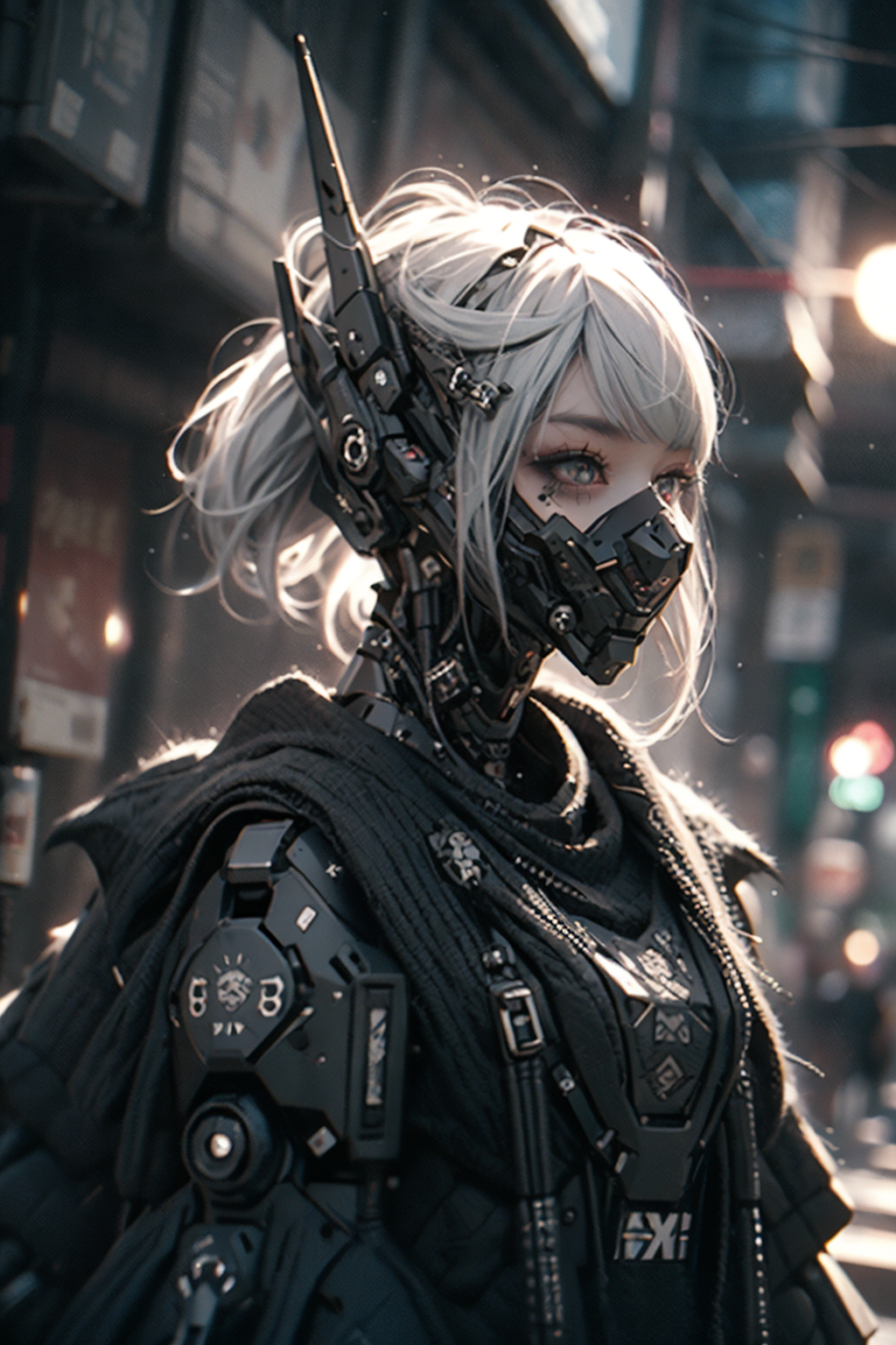 goth_punk, roblit, 1girl, robot, solo, medium shot, walking in Harajuku, ((night time:1.2)), bokeh, neon light, (colourful background:1.2), iridescent eyes, starry sky, white shimmer hair, white eyebrow, glowing hair, (iridescent white hair), earrings, bangs, jewellery, mask, blunt bangs, green eyes, mouth mask, blurry background, blurry, hair ornament, looking at the viewer, short hair, portrait, sidelocks, (with a robotic dragon pet wrapped around the body:1.2), <lora:Gothpunk:1>, <lora:add_detail:0.2>, <lora:robotbattle:0.8>
