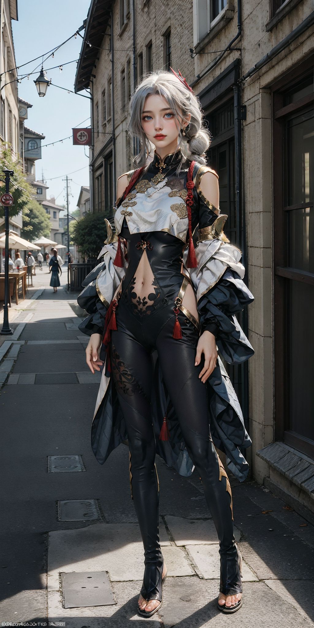 <lora:Shenhe_remake:0.9>, shen_he_(genshin_impact), 1girl,(dynamic pose), (black bodysuit), (hair ornament), white hair, (braid ponytail), black sleeves, breasts curtain, jewelry, hip vent, shoulder cutout, navel, sandals, full body, standing, (masterpiece, high quality, best quality), (colorful),(delicate eyes and face), volumatic light, ray tracing, bust shot ,extremely detailed CG unity 8k wallpaper,solo,outdoors, Cobblestone Streets, Quaint Architecture, Charming Cafs, Flower-Filled Window Boxes, Cozy Boutiques, Lush Greenery, Vibrant Market Stalls, Riverside Scenes, Vintage Lampposts, Old-world Elegance