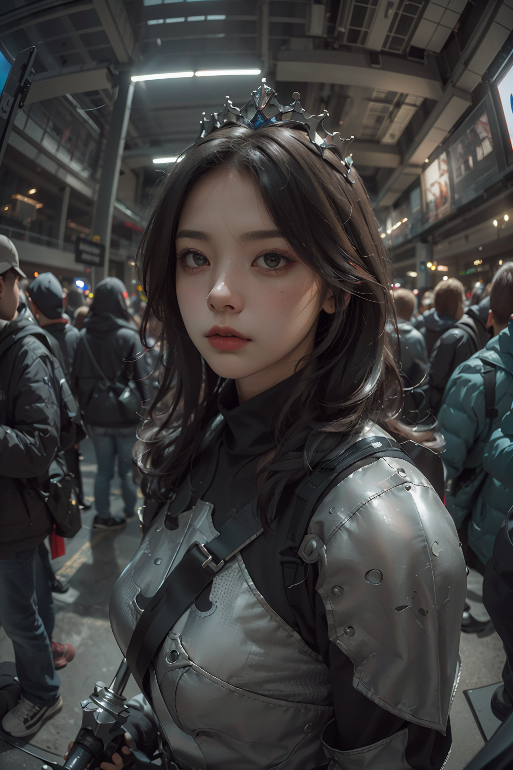 (masterpiece, best quality, photorealistic, ultra high res, 8K raw photo:1.1), fisheye, depth of field, crowd, crossroads, 1girl, knight, crown, holding weapon, looking away, awe,