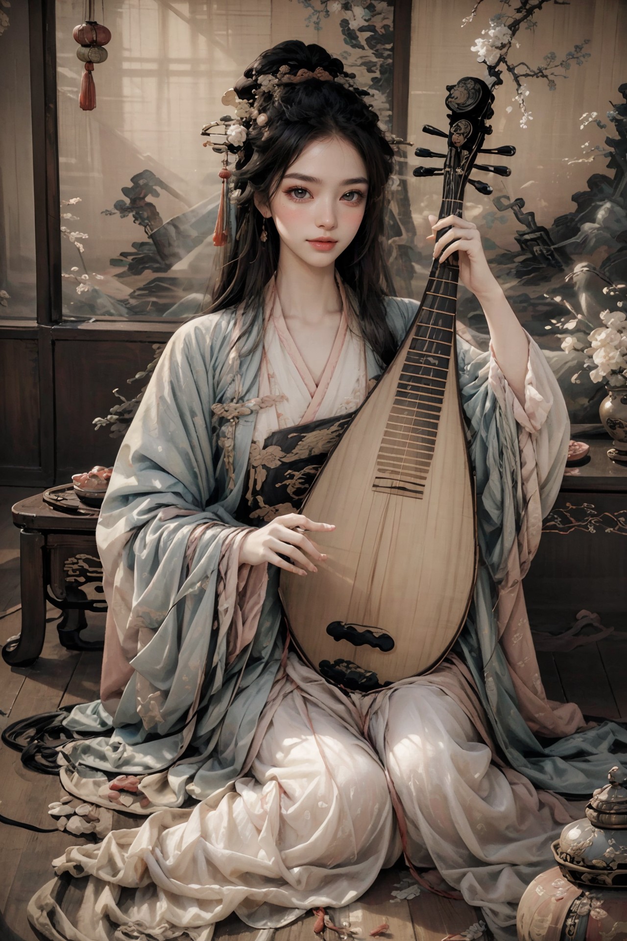 1girl,blush,eyelash,(half updo:0.1),messy hair,make up,powder blusher,beautifully detailed big round dark brown eyes,double eyelid,supermodel,detailed shiny pale skin,smile,looking at viewer, large breasts, hanfu,chinese clothes,long sleeves,black hair,hair ornament,chinese painting mural,sitting,low wooden table,ancient china,pipa,playing pipa,pipa \(instrument\), lute,<lora:~Q?-t5t6_V2:0.8>, masterpiece,best quality,high quality,highres,natural light,ray tracing,volumetric light,realistic,photorealistic,ultra highres,<lora:add_detail:0.5>,<lora:epi_noiseoffset2:0.1>,