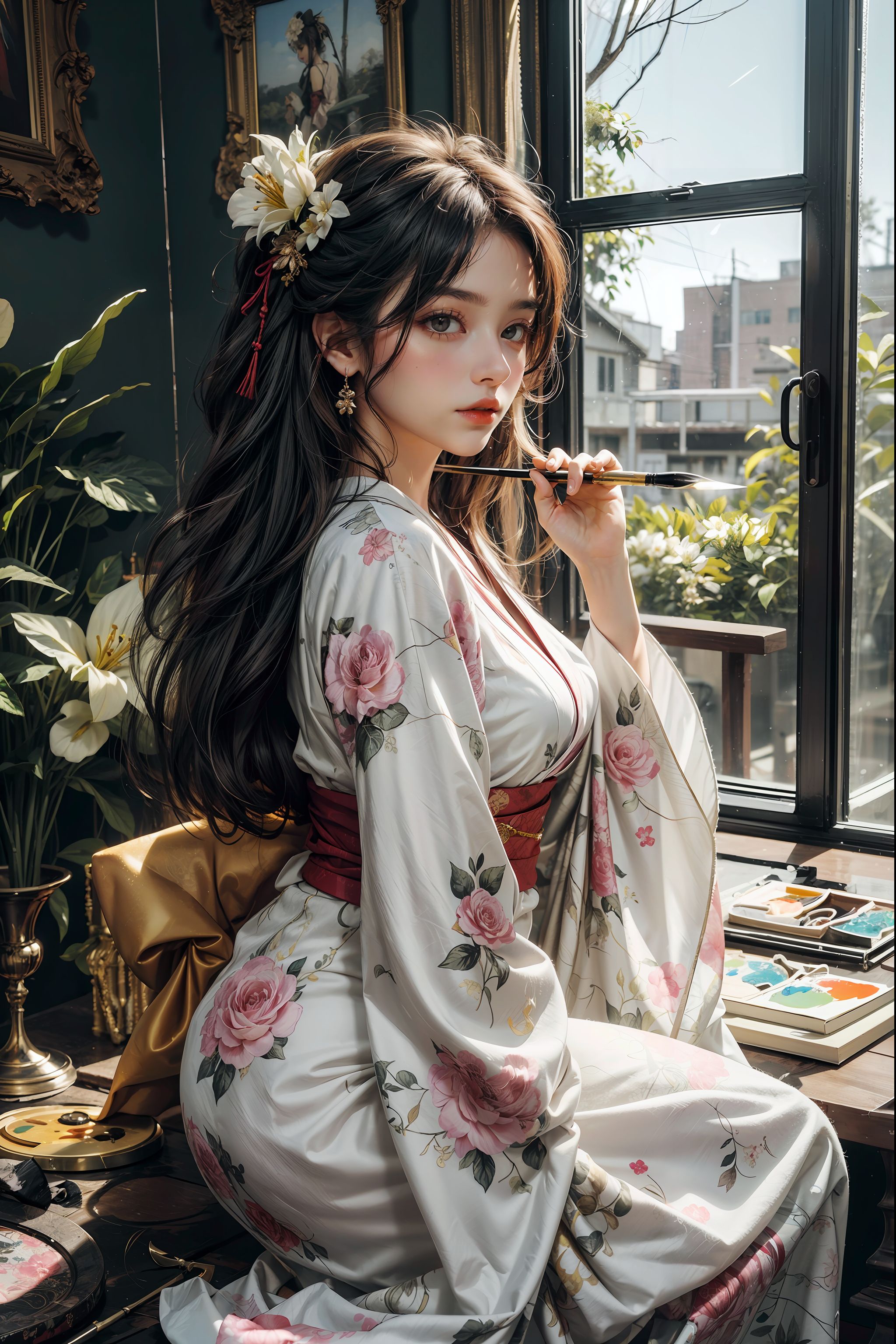 (absurdres, abstract, artwork, official art, depth_of_field:1.2), (blurry background:1.4), (private_garden of modern and chic design:1.4), (all of walls with vertical glass style:1.6), soft and warm lighting, (profile, feet out of frame:1.2), ((1girl, solo)), (look at viewer:1.2), dynamic pose, (outdoor), (painting \(action\):1.5), painting \(object\), art brush, paintbrush, palette \(object\), watercolor painting on large canvas \(object\), holding, holding small-paintbrush and palette \(object\), art tool, dramatic shadows, BREAK artwork display shelves with finished paintings, BREAK picture frame/curtains, BREAK soft backlighting from wide and huge frameless window, BREAK (flower field), branch, flower, lily_\(flower\), orange_flower, pink_flower, sunflower, white_flower, yellow_flower, earrings, jewelry, long hair, (wavy hair), (stylish, elegant, Japanese clothes, dress, long dress, frills, long long sleeves, (wide sleeves:1.2), floral print, kimono, print_kimono, dress), light_makeup, ((teenage)), human body ratio, pale skin, shiny skin, parted lips, realistic, realistic_scale, (best quality:1.4), (masterpiece:1.4), (extremely intricate detail), extremely delicate and beautiful, beautiful and aesthetic, (cute, pretty), <lora:add_detail:0.8>,