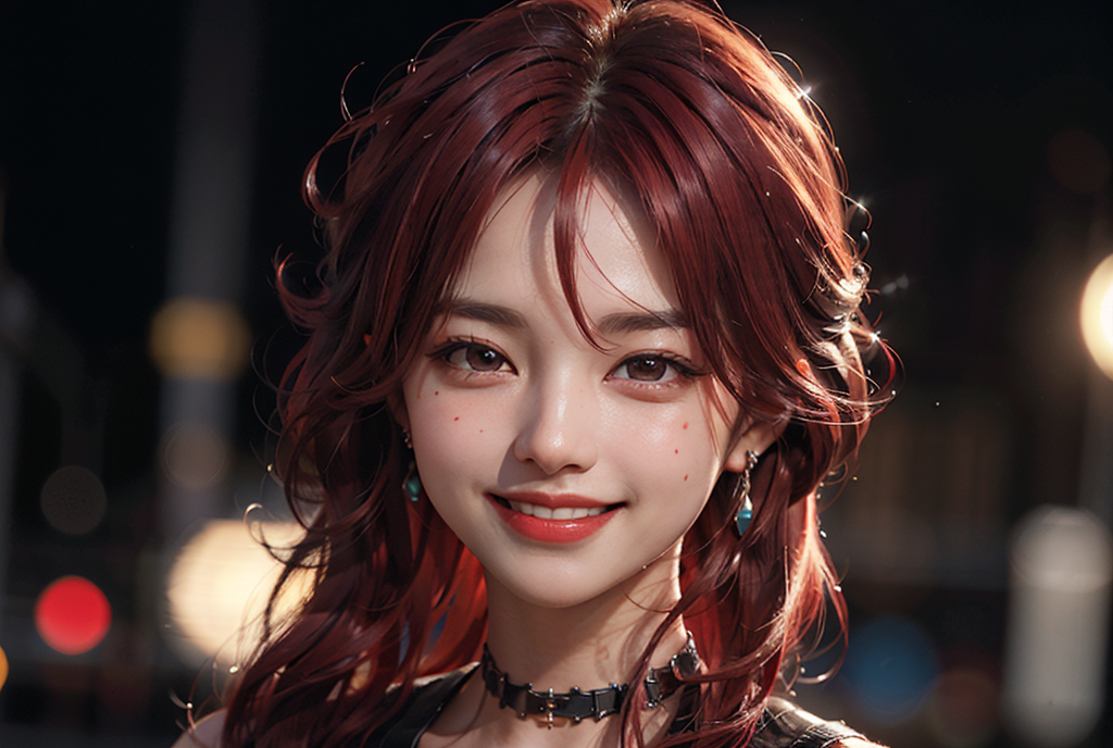 1girl (30yo) stunningly beautiful mature Japanese girl, standing, facing camera, long dynamic black hair with ((red hair)) highlights, realistic skin, subsurface scattering, black choker, earrings, (smiling:1.4), dimples, standing, (intricate background), ((cinematic lighting)), professional photograph, dramatic lighting, (deep shadows), backlight, rimlight, ((night, dark, dim)), <lora:JapaneseDollLikeness_v15:0.2> 8k, raytracing, highest quality, masterpiece