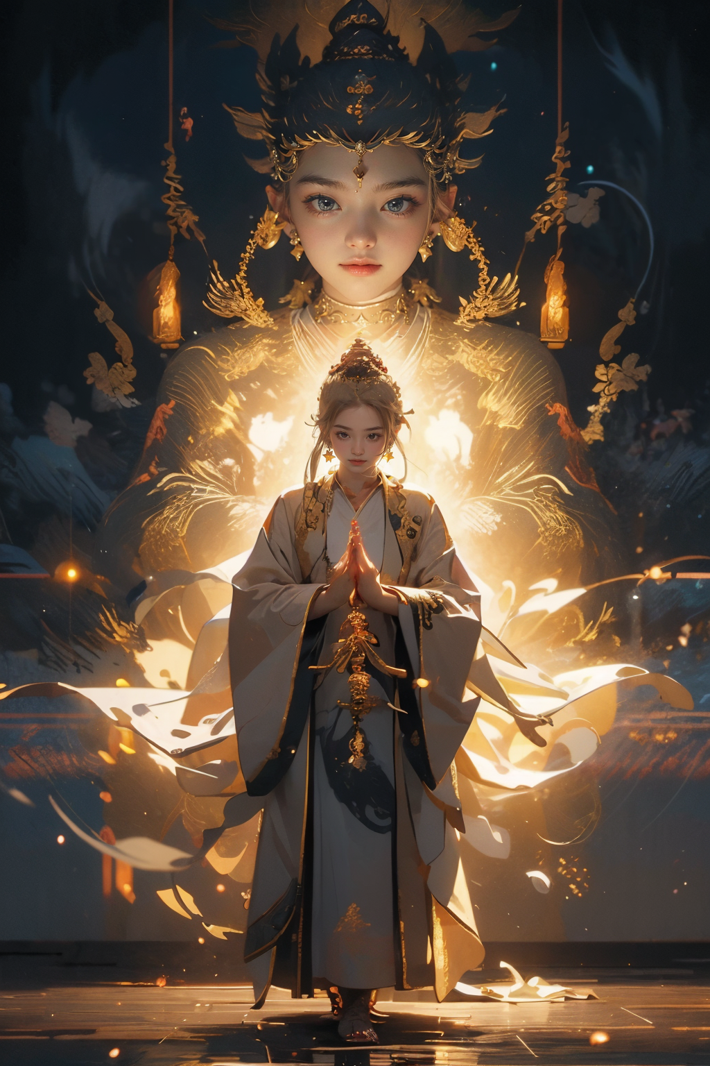 (masterpiece:1.2),best quality,PIXIV,taoist,(meditation:1.3),Daoist_Robe,closed eyes,full body,Keep head down, solo,a buddha standing in front of blonde,glowing taoist,transparent,<lora:taoist_20230623200708:1>,<lora:Daoist_Robe_v2:0.4>,
