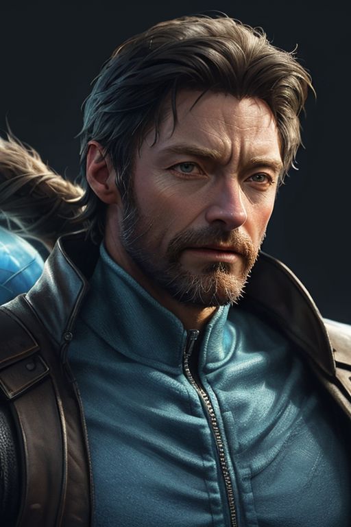 Royal _ misty _ fantasy _ digital _ dynamic_ art _ fighting _style _ of Hugh Jackman as old man Logan, 30mm portrait, photorealistic fantasy concept art, trending on art station, perfect stunning visuals, creative, HD ultra cinematic, detailed, blue and dark yellow comic suit, Jungle Float, no gravity, extremely _ detailed _ artgerm _ greg _ rutkowski _ greg_4k
