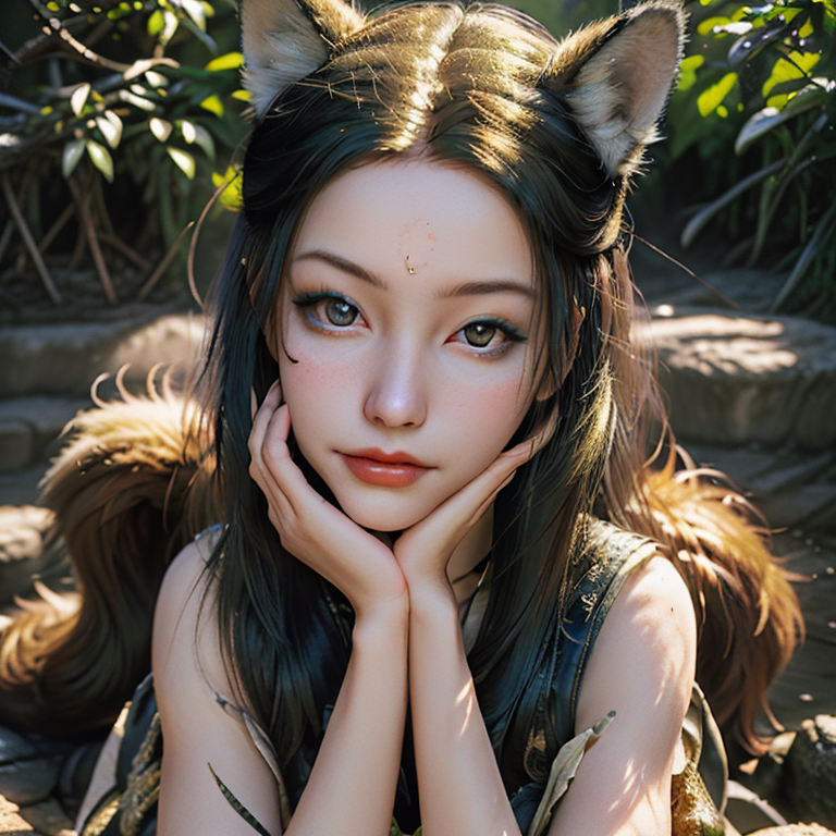 The model wears an elaborate headpiece made entirely of leaves, flowers and vines that cascade down and frame her face. Her makeup is done in green and gold tones to match the natural theme. She gazes serenely at the viewer with a Mona Lisa smile. The overall color palette is bright spring greens, big eyes, climbing on ground, , accentuated with warm sunlight effects. full body,(RAW photo, best quality),(realistic, photo-realistic:1.3), clean, masterpiece,finely detail,masterpiece,ultra-detailed,highres,(best illustration),(best shadow),intricate, bright light,chonger, <lora:chonger_20230603023449:0.5> chonger, furry fox tails, <lora:chonger furry fox tails_20230605024454:0.5>
