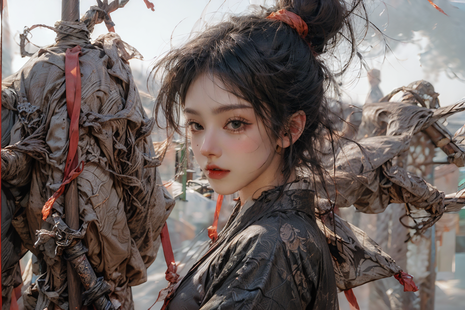 (RAW photo, absurdres,highres,best quality,National Geographic award winning),(realistic, photo-realistic:1.3),film grain,(Fujifilm XT3),super detail,high details,best quality,masterpiece,an extremely delicate and beautiful,extremely detailed,CG,unity,8k wallpaper,Amazing,finely detail,masterpiece,best quality,extremely detailed CG unity 8k wallpaper,absurdres,incredibly absurdres,huge filesize,ultra-detailed,highres,extremely detailed,iu,asymmetrical bangs,short bangs,bangs,beautiful detailed girl,extremely detailed eyes and face,beautiful detailed eyes,(caustics,global lighting,cinematic lighting),(panorama),wuxia, BREAK, Best quality,masterpiece,ultra high res,1girl,beautiful_face,detailed skin,<lora:gu:0.6:CLOTHING>,gu,dragon,full body,,weapon,black hair,holding weapon,blood,arm guards,male focus,looking at viewer,black eyes,tabi,floating hairfull body,orange,<lora:wuxia:0.8>, ,upper body,on side,<lora:bamboohat_v2:0.8>,<lora:FilmG4:0.35>,<lora:add_detail:1>,<lora:epiNoiseoffset_v2:0.8>,