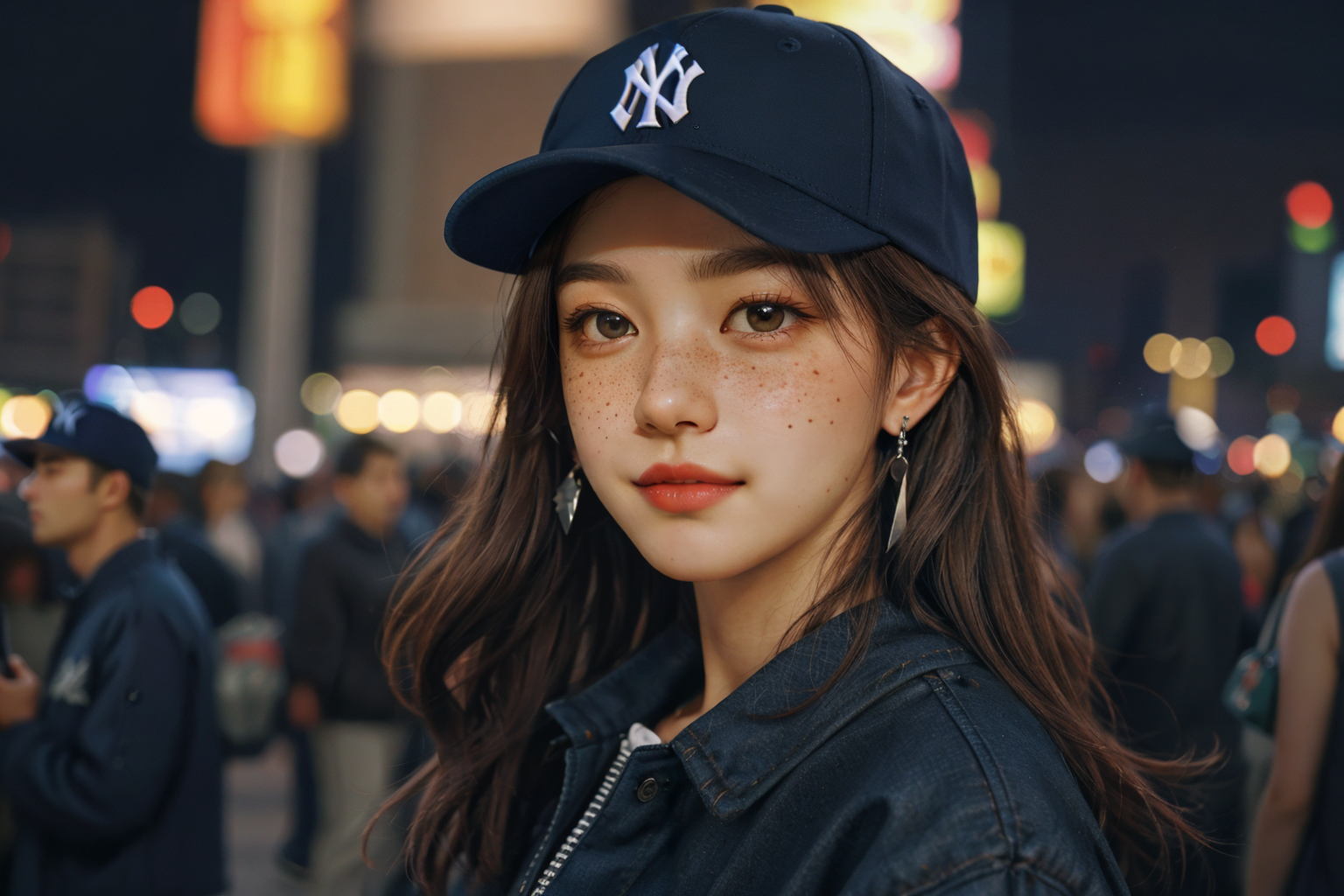 RAW photo, best quality, photo realistic, masterpiece, ultra detailed, 8k wallpaper, detailed face, beautiful dark brown eyes, 1boy, 24 y.o, sharp focus, depth of field (f/2.6, 35mm), looking at viewer, smirk, (upper body, cowboy shot), (streetwear, new york yankees baseball cap, earrings), nose blush, freckles, brown hair , in rockerfeller center, night, (crowd, multiple people), FilmG, <lora:FilmG4:0.8>
