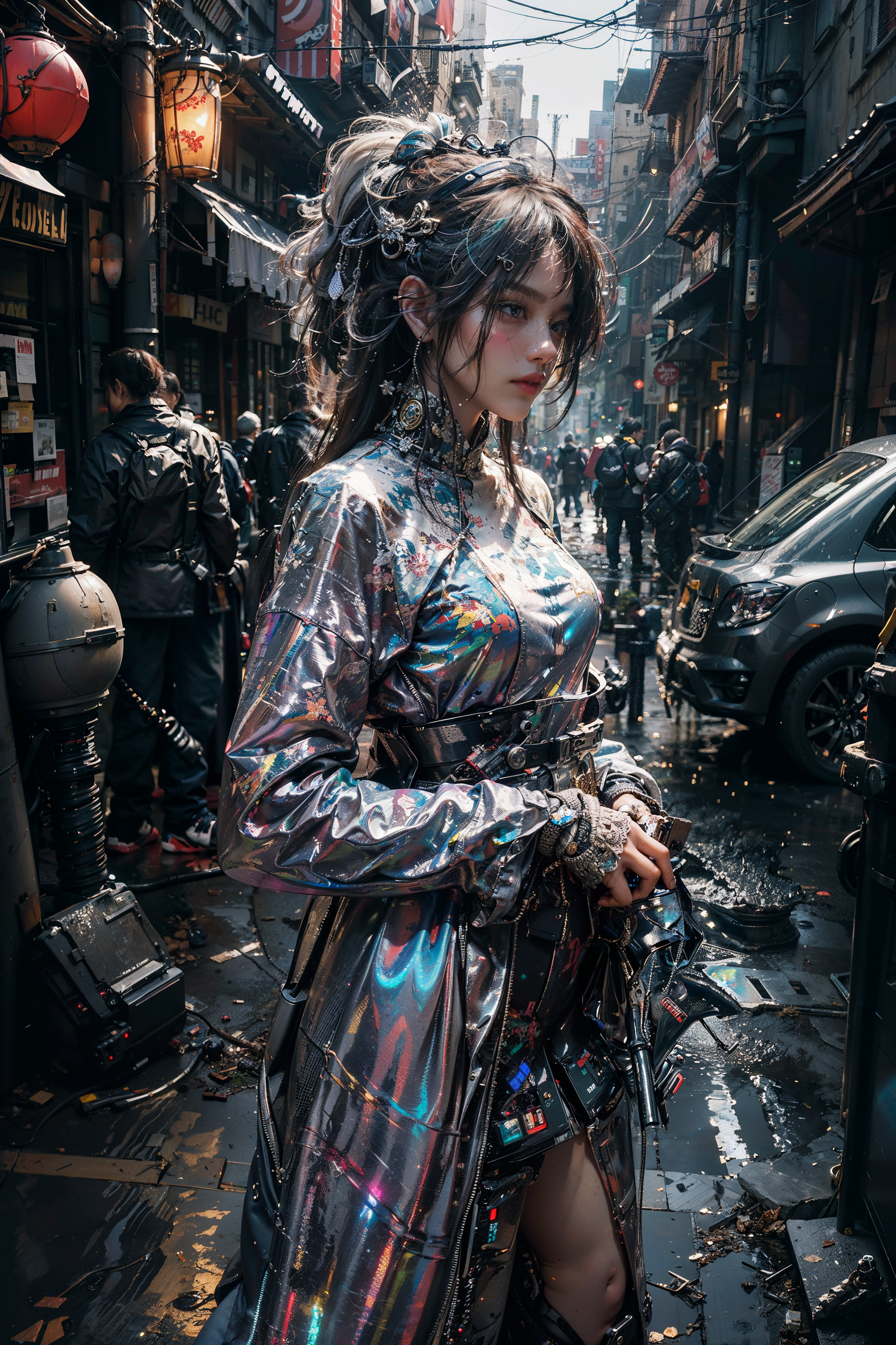 best quality,ultra-detailed,photorealistic,robotic, 1girl,young swordswoman,slim body, holding a glowing katana,futuristic cyberpunk night city , outfit blending futuristic technology, cyberpunk city guard, katana behind his back, long hair, white hair,,(guardian of the city:1.2), gacha splash,(harsh urban environment:1.3),(determination and bravery:1.2),masterpiece,cyberpunk style with Chinese influenceg, headband, car crash, night, rain, puddles, cyberpunk lights, , extreme detailed,,, (long hair:1.3),(iridescence holographic Clothing:1.1) <lora:hanfu_clothes_LORA:0.4>, <lora:reel_mech_robotic:0.9>,<lora:planet_Simulator_style_Lora:0.6>,<lora:add_detail:0.7> <lora:iridescence_holographic_Clothing:0.6>