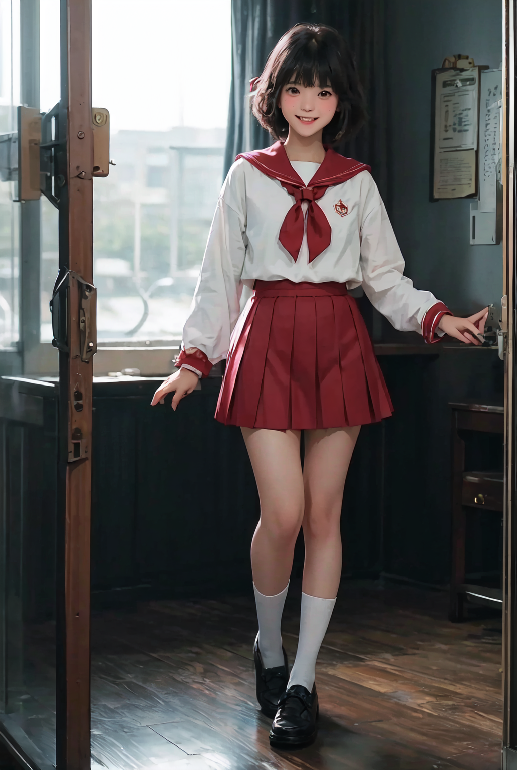 (masterpiece, realistic, ultra high res, high quality:1.2), 1girl, (young),black short hair, blush, red cheek, old photo, 80s style , dynamic pose, studio, ((full body)), smile, fang, sailor school uniform, ((seikomatsuda)) <lora:seikomatsuda:0.5>