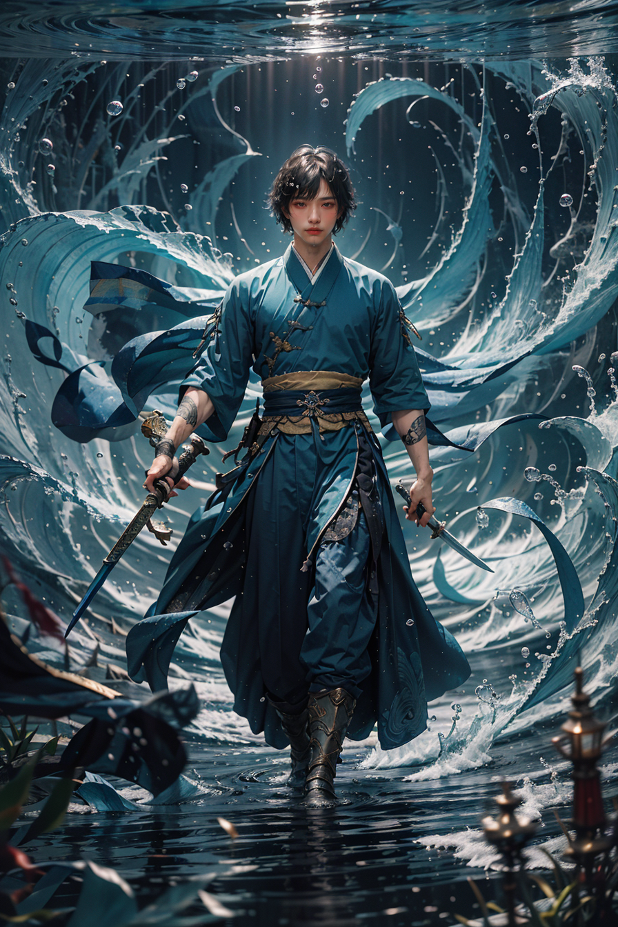 (absurdres, highres, ultra detailed)(masterpiece), (extremely intricate:1.3), (realistic),cyberpunk city,Cinematic Lighting,4k,(masterpiece), (1boy:1.2),solo male,man,((male focus)),hanfu,chinese clothes,blue dress,long dress,short hair,gonggongshi, water,Cast magic, cast water magic,water ball on the hand,In the valley,full body,Sword, weapon, hand-held weapon, sword surrounded by water element,hanfu,chinese clothes,blue dress <lora:æ°´ç¥å ±å·¥æ°Gonggongshi_V2.0:0.6>