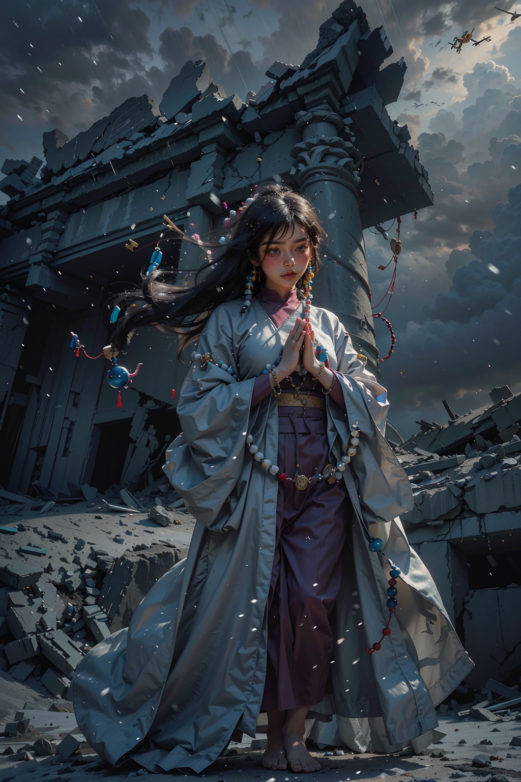 (RAW photo, 4k, masterpiece,unity 8k wallpaper,high res, realistic, extremely intricate) extremely detailed background,(cinematic lighting),(moody lighting)epic composition,vivid colours, romanticism, zhongfenghua,depth of field,perspective, (A east asian Buddhist nun holding a string of Buddhist beads stood on the ruins after the earthquake,with sad and serious expression, ) mourning for the victims of the earthquake, who had passed away,she was wearing a very long grey robe, (the wind lifted the hem of her long robe:1.6),reciting words in her mouth,(praying,putting hands together:1.6)(a string of Buddhist beads in both hands:1.6)(the ruins after the earthquake:1.6) (snowing heavily:1.5)(dull weather)(face front:1.4)(from below:1.5)(close up:1.3)((full body))(perfect bare feet)((outdoors))