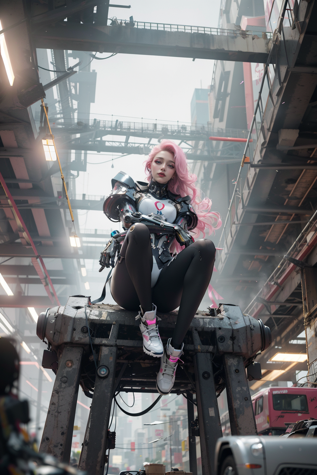 realistic, complex 3d render ultra detailed, 150 mm, beautiful studio soft light, rim light, vibrant details, luxurious cyberpunk, Complex background, octane render, 8k, best quality, masterpiece, illustration, an extremely delicate and beautiful, extremely detailed ,CG ,unity ,wallpaper, (realistic, photo-realistic:1.37), Amazing, finely detail, masterpiece, best quality, official art, extremely detailed CG unity 8k wallpaper, dynamic angle, dynamic pose, cowboy shot, from below, 1girl, detailed face, detailed eyes, looking at viewer, cold attitude, ((white:1.3 | pink:1.4 hair)), (very long hair:1.3) , armor, bodysuit, mechanical arms, Cyberpunk dystopia, City streets, (In the ruins of a cyberpunk city after a thermonuclear war, broken neon signs hanging from buildings, neon signs), Neon lights, fluorescent lights, smoke, Syd Mead, Cyberpunk, lots of exposed broken cables, Neon black and white, Unreal Engine, <lora:nijiMecha:0.8> <lora:hipoly_3dcg_v7-epoch-000012:0.5>